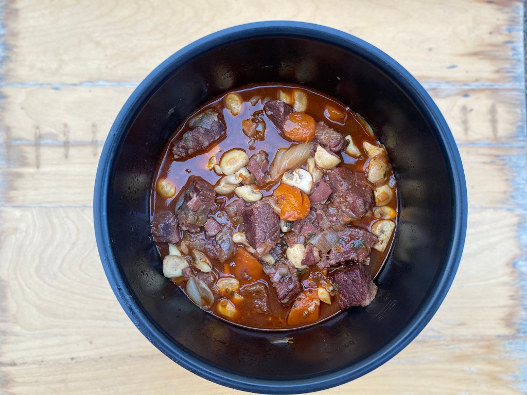 If you don’t want your carrots and onions to be too soft, we would suggest setting the timer for 15 minutes first, take out only the vegetables , and then set the timer for another 45 minutes for the brisket to become super tender. We don’t mind our vegetables softer and like to save some time from the natural releasing of the pressure cooker, so we leave them in for the entire hour. Mushrooms, however, like the original Julia Child’s recipe, we cook them separately, and near the end, we add them in prior to drizzling the reduced sauce.