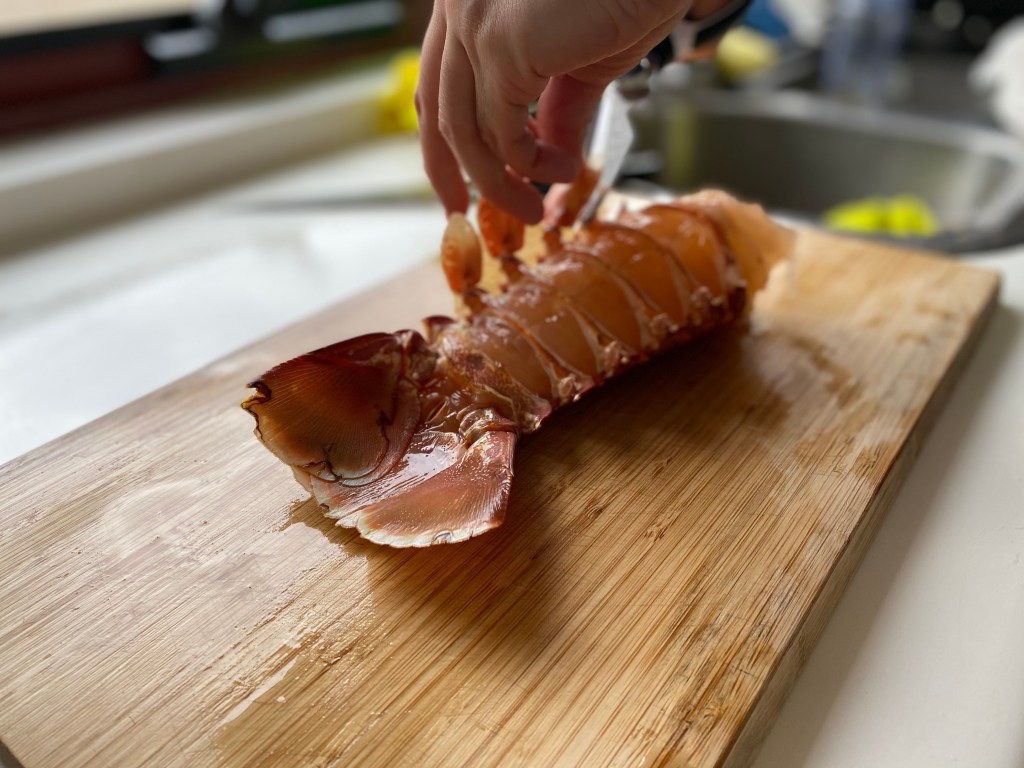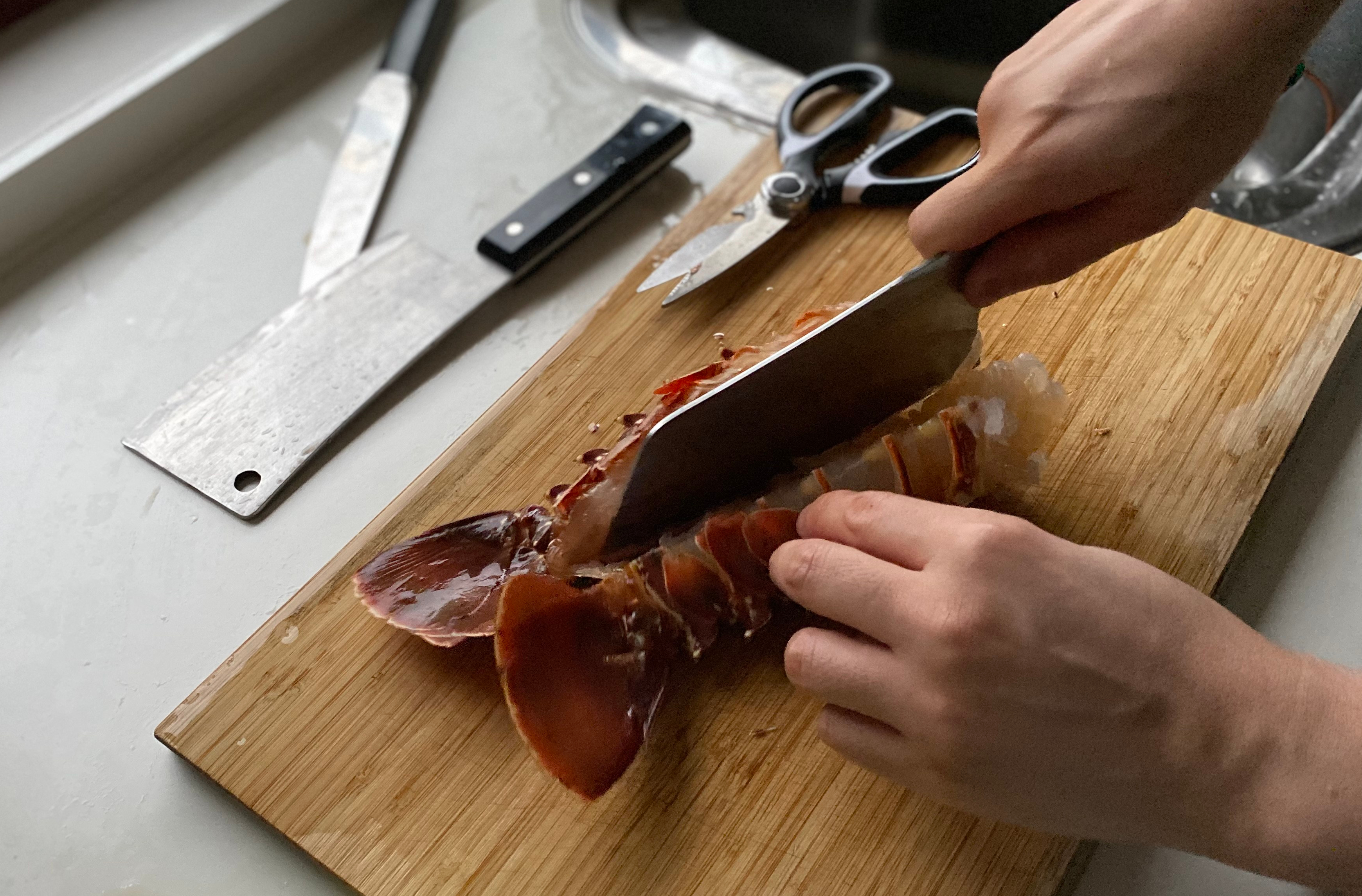Killing the lobster can be tough and messy. Get ready with protective gloves or towels so you don’t get pricked easily. Expect dark liquid to spill all around. So, have the towels ready nearby. You will need a good sharp sturdy knife, a thick wooden chopping board and having a sharp kitchen scissors will make your life much easier as well. We ended up using 3 knives, as all of them were not sharp enough! We needed two cleavers (one heavy and one thin-and-sharp) to slice through the shell and tough parts, and 1 long/chef’s knife to pierce through the lobster head. To kill it, you want to place it so that the belly is facing down on the chopping board, firmly holding the lobster where the tail connects to the body. Place the chef knife at the cephalic groove and in one quick motion cut through its head, right between its eyes .