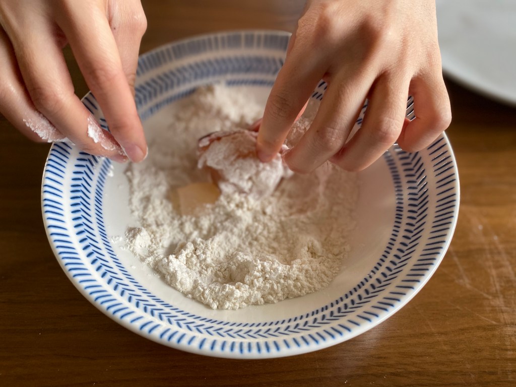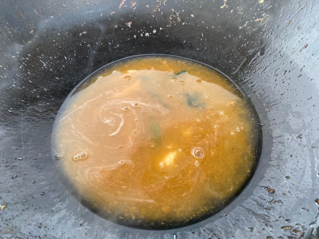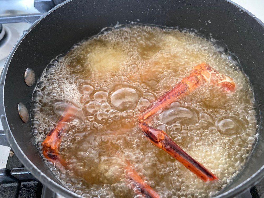 Next, you must drain its pee. Use a wooden chopstick or one of the lobster’s antenna to poke through its bum hole near its tail end. Give it a good twist whilst you poke through, then hold it up with the tail side down, and you should notice a murky liquid draining out. Once drained, twist the tail off, and snip of the swimmerets with the scissors. Don’t be alarmed if the lobster is still wriggling. Cut the tail in halves by first using the scissors to cut the belly and back surfaces of the shell, then with a knife to halve the flesh. Remove the intestines and veins. Further chop up the halved tails into 4 or 5 smaller bite size pieces. As for the head and legs, completely halve it. Separate the legs from the head. Discard the lungs. There should be a soft yellow green substance in the cavities, the tomalley, we like to save it aside and use it for the sauce. It is optional, but it definitely gives the sauce a creamier texture with an intense yummy flavour. The legs can be chopped into 3 parts with the prickly leg ends chopped/snipped off. Finally, make sure to wash every piece thoroughly getting rid of any black liquid, and pat them dry after.
