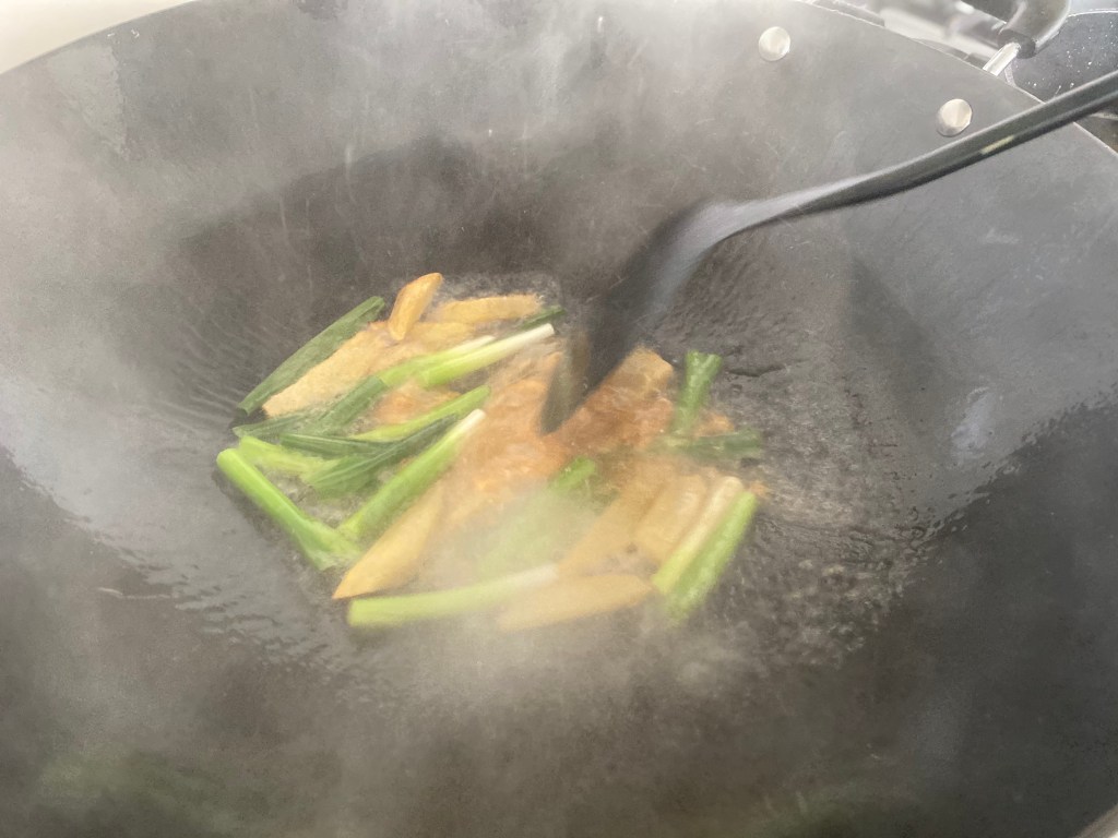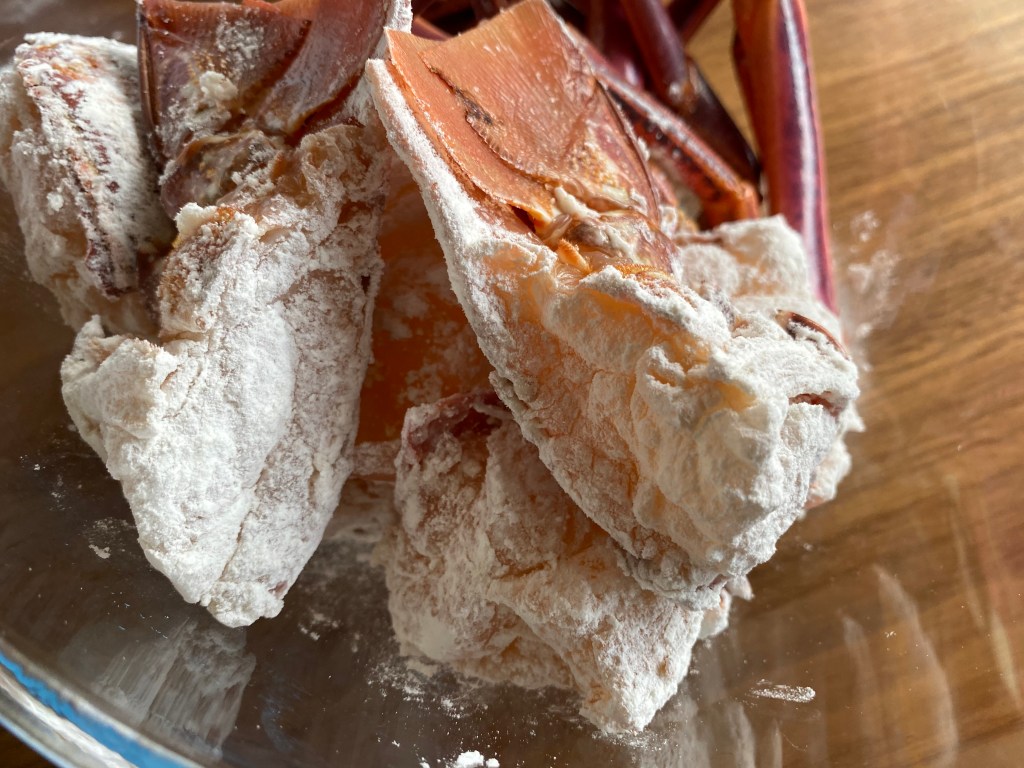 Once dried, lightly coat flesh parts of the lobster pieces with the flour, cornstarch and salt mixture and deep fry them! This keeps all the yummy juices in them. The shells should turn into a beautiful bright red colour almost instantly. After flash frying them, get ready for the wok!