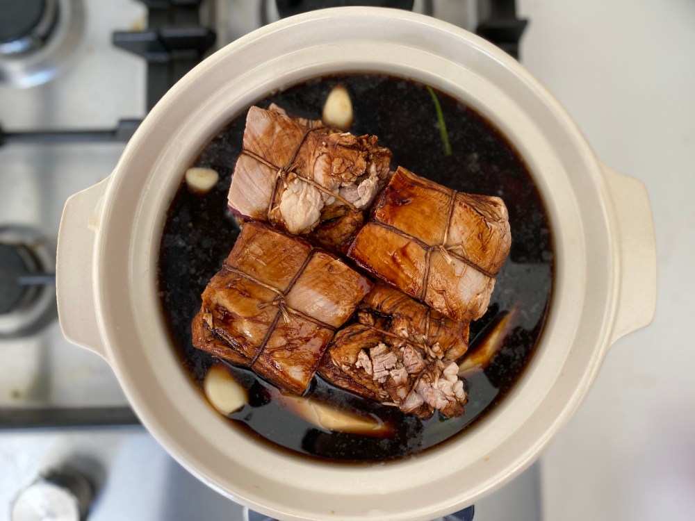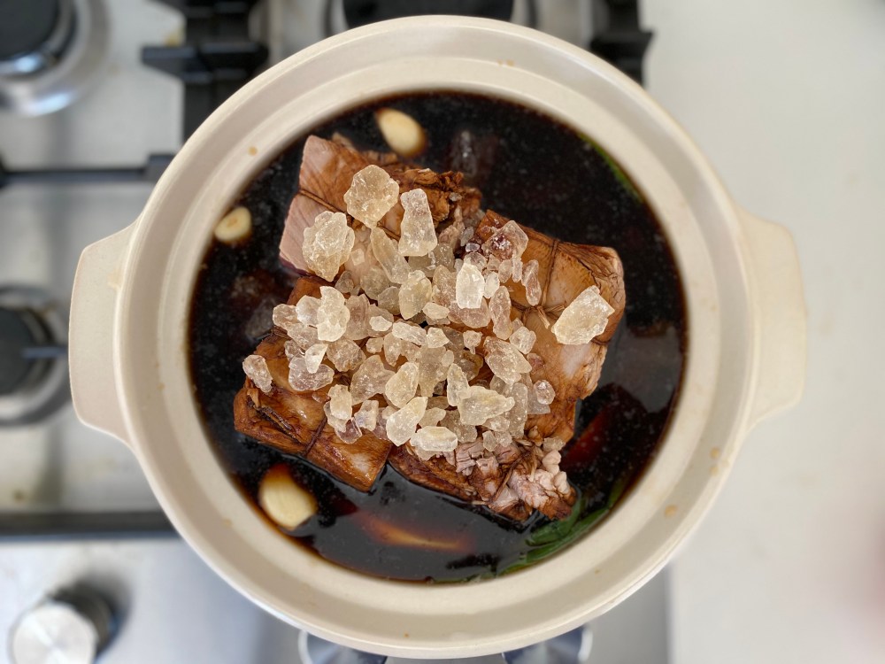 To prepare, make sure to wash pork belly as a whole, and remove most of the hair by burning it off. In some occasions, we even had to pluck them out with tweezers. If you are lucky, you may get a piece that does not have much hair on the skin. Blanch pork belly as a whole afterwards to remove most of the blood, and then cut them into smaller pieces. If you like larger pieces, you may not need to tie them with cooking twine, as they are less likely to fall or shred apart. We like to use more spring onions for extra flavour and extra ‘padding’ to avoid pork from sticking onto the base of the clay pot and burning them. We also use A LOT more ginger, this gives a subtle delicious gingery flavour to it on every bite, instead of it just tasting very ‘soy-saucey’.