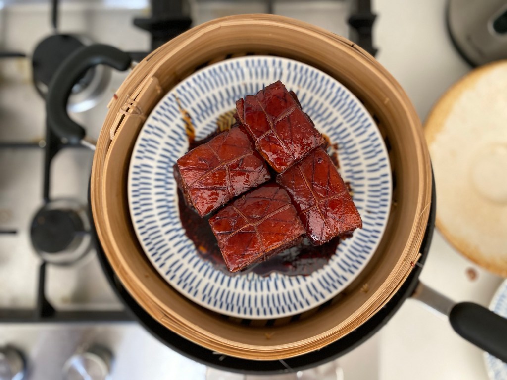 For the first 90 minutes, pork belly pieces should be placed skin side down, then later on flipped skin side up for the rest of the cooking, whether it be continued simmering in the clay pot/wok or steaming. Steaming cooks slowly, hence the longer hours. Alternatively, if you choose to simmer, continue simmering for another 90 minutes. We have tried the latter before and found that the meat was drier and saltier.