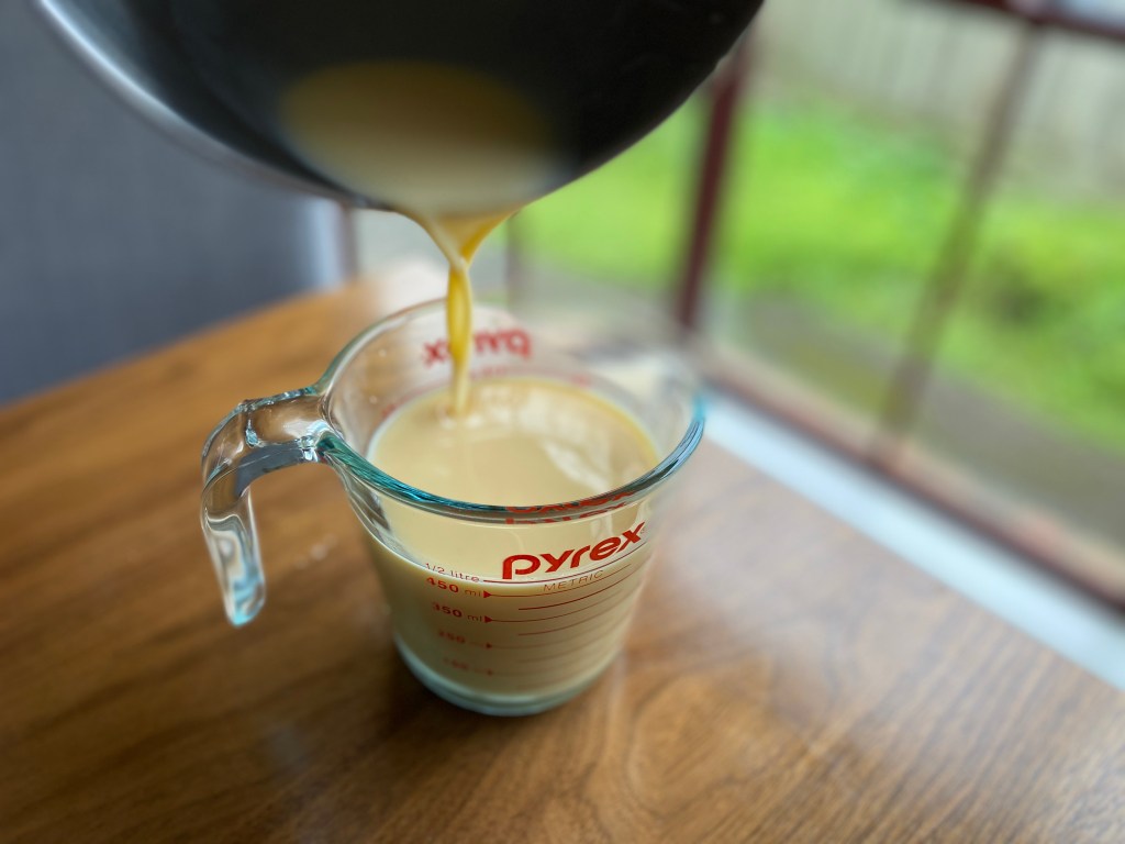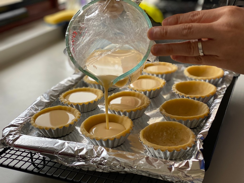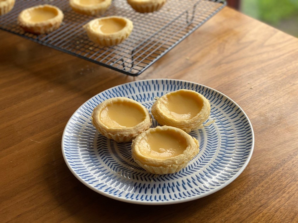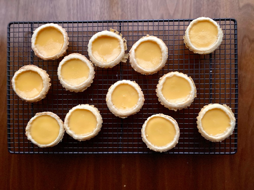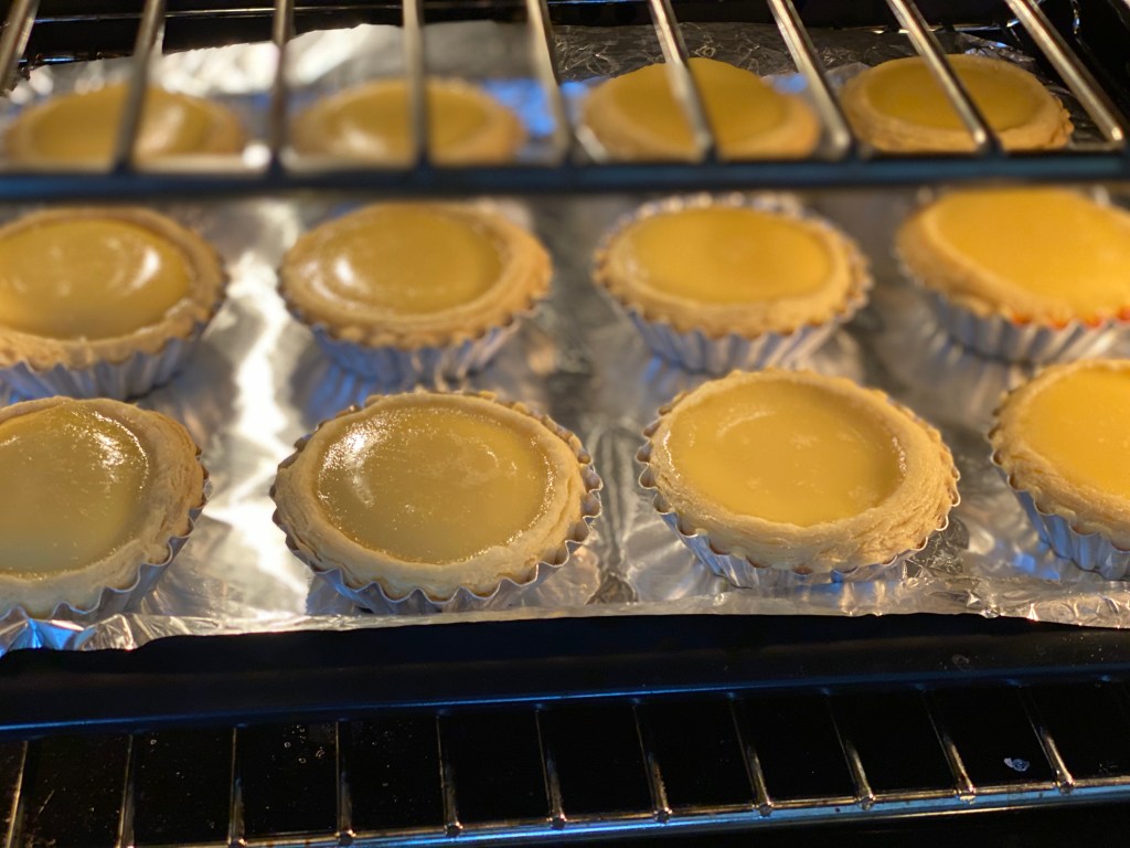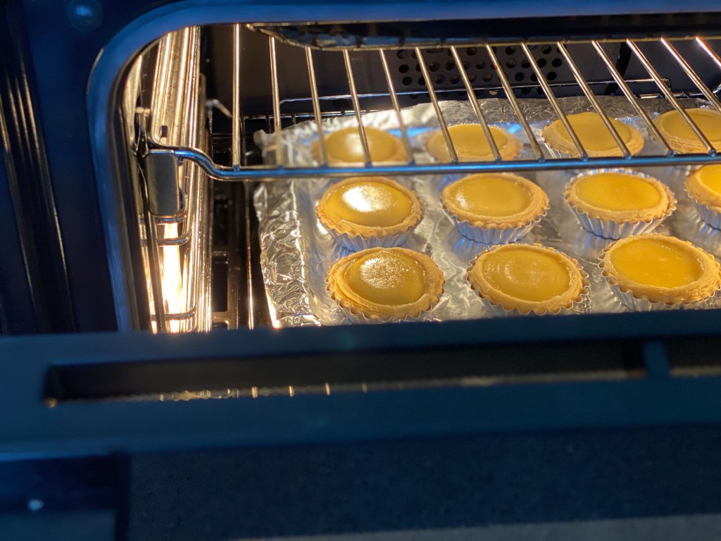 When ready to bake, place egg tart bases on a baking tray, and slowly pour in the egg filling into each of them to about 80-90% of the height, and remove air bubbles. You then very steadily carry the tray into the oven, and bake for 15 minutes first, then reduce temperature to 180°C, and bake for another 10 minutes. If you want a completely smooth shiny surface, you have to keep a close eye on them in the beginning. We tend to open the oven after 10 minutes to remove air bubbles again or any thin protein film layer due to the milk. Be careful, it’s hot, don’t burn yourself! If you see the egg filling dome rising too much, reduce oven temperature to 170 or 180°C. You may also open the oven door slightly to lower the temperature. So keep a close eye on them again near the end! Once done, switch off oven and keep the oven door slightly open, and let them bake in the residual heat for 10 minutes.