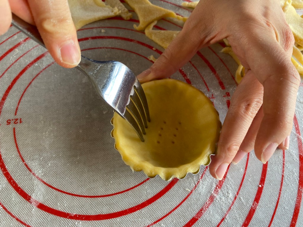 It is recommended to cut a bigger size circle to the circle size of the mold. We used stainless steel egg tart molds with a diameter of 7 cm and a cookie cutter with a diameter of 8 cm. If pastry circles get softer or ‘melting’, let them chill in the fridge for another 15-20 minutes again so that if you can mold them with ease. If you work faster, you should be able to mold them straight after cutting the circles. Press the dough against and up towards the sides and bottom, allow a bigger space for more egg filling. Poke holes on the base with a fork to let air bubbles out. Place them back in the fridge to chill again for another 20 minutes. Whilst waiting, preheat the oven to 200°C. Depending on oven type, make sure to use pastry or baking setting or more specifically, ‘Bottom Element Heat‘, so that heat comes from the bottom. This is to ensure that the pastry is uniformly cooked and egg filling does not overheat at the same time.