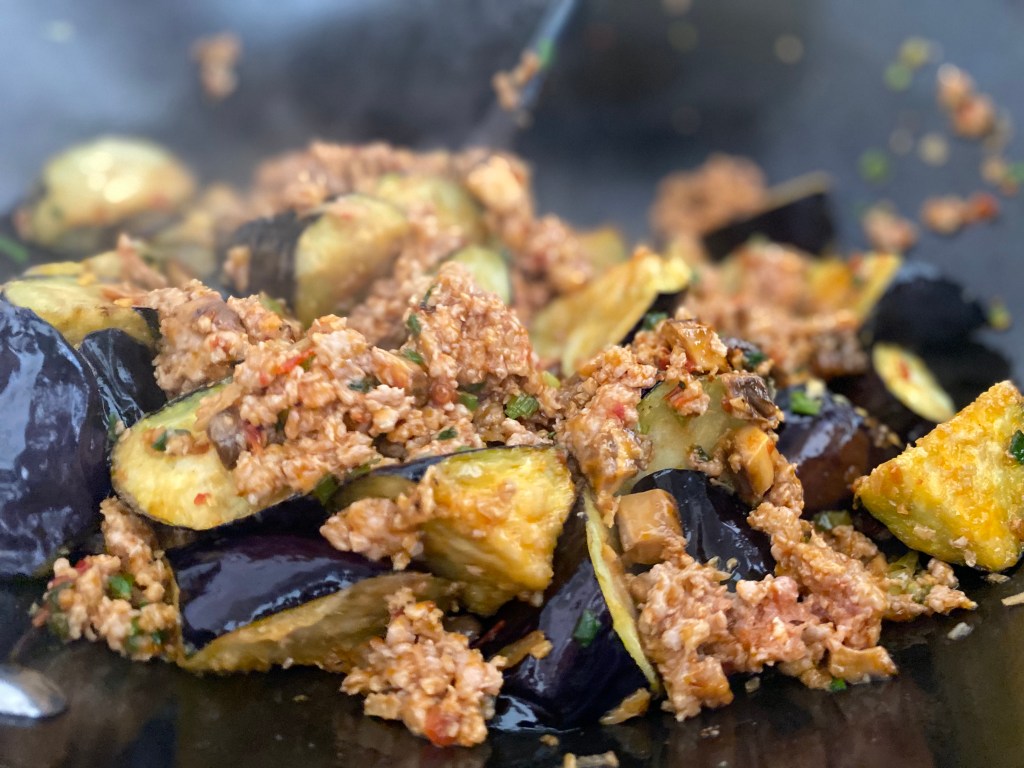 When ready to stir fry, heat the wok to medium to high heat. Add in a couple tablespoons of oil followed by minced garlic, spring onions and dried cuttlefish. When fragrant and garlic lightly browned, add in minced pork and stir fry a little to evenly brown the mince, then add in the chilli bean sauce, black vinegar and sugar. Stir fry and break up the mince at the same time for about 1 minute, followed by adding eggplant pieces. Stir fry for a short 10-15 seconds to evenly coat eggplant pieces with sauce mixture and turn the heat off. Transfer to a clay pot. FYI, don’t worry about the pungent smell from the cuttlefish if you are not used to it! Once you add in the sauce, it will merge nicely together giving you a nice fragrance.