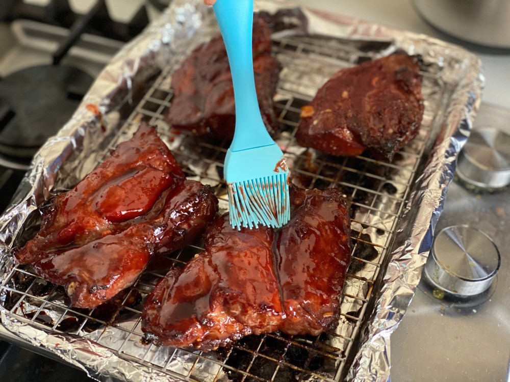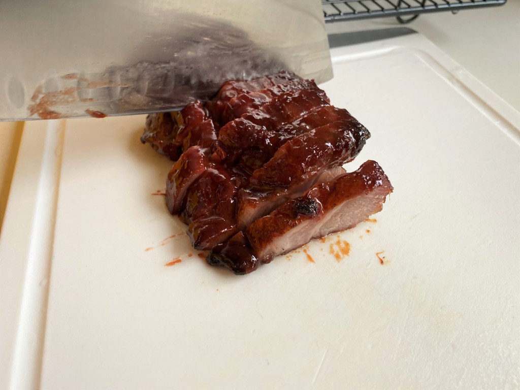 Preheat the oven to 180°C. Remove pork from refrigerator and let it rest for 20 minutes. If possible, wrap a tray with aluminium foil, place a rack on top of it and then place the pork on the rack for it to rest. It is easier to clean up the tray afterwards. In the meantime, make the basting marinade by pouring the marinade in a saucepan, add 2 tablespoons of maltose, bring to a simmer and reduce for 5 minutes or until it thickens. Baste the pork and oven it for 20 minutes. Baste again and flip the pork and oven for another 20 minutes. Finally, increase the oven to 200°C and continue basting and flipping the pork after every 5 minutes for 20 minutes.