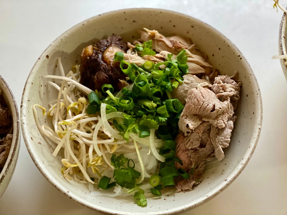 Everything else afterwards is straight forward. Boil water and let it simmer, cook one serving of Pho noodles, depending on which Pho noodles you get it should take approximately at most 1 min to cook. Place cooked noodles in the bowl. On a separate pot, boil water and let it simmer, cook one serving of sliced meat and cook slightly under to your liking. Place partially cooked meat on top of the noodles. Add the other meats, garnish to your liking and then pour the hot broth to the bowl and serve.