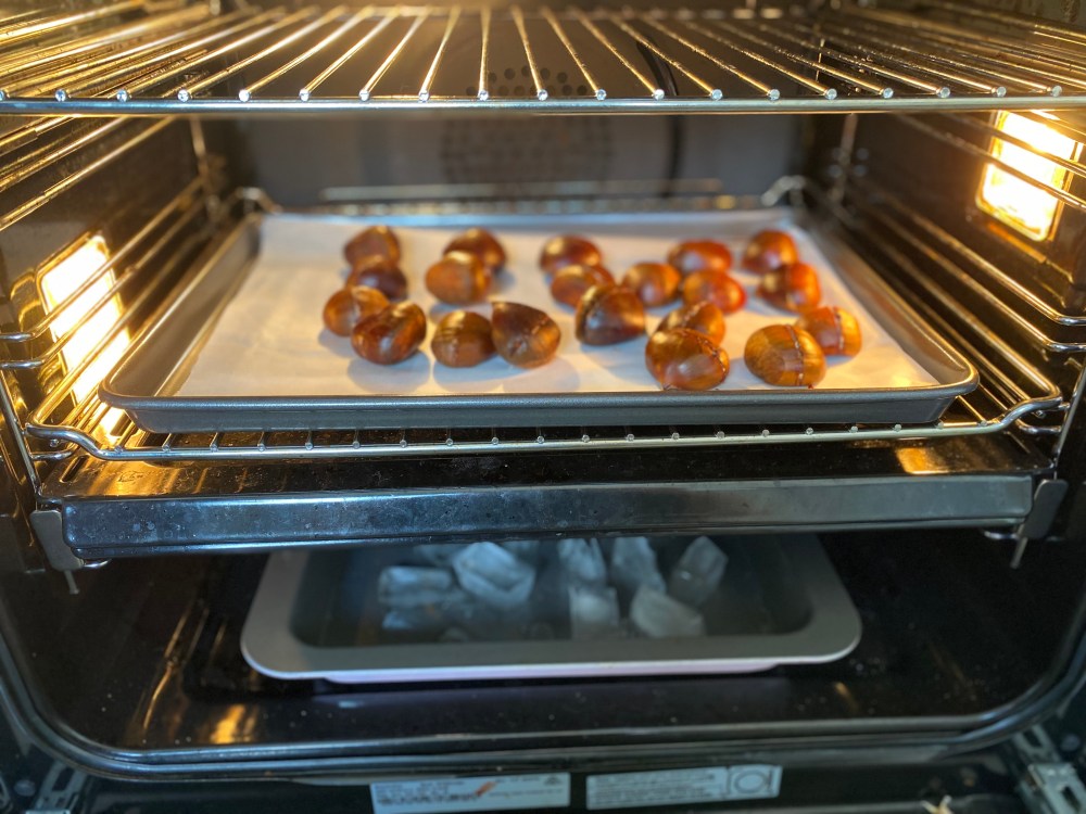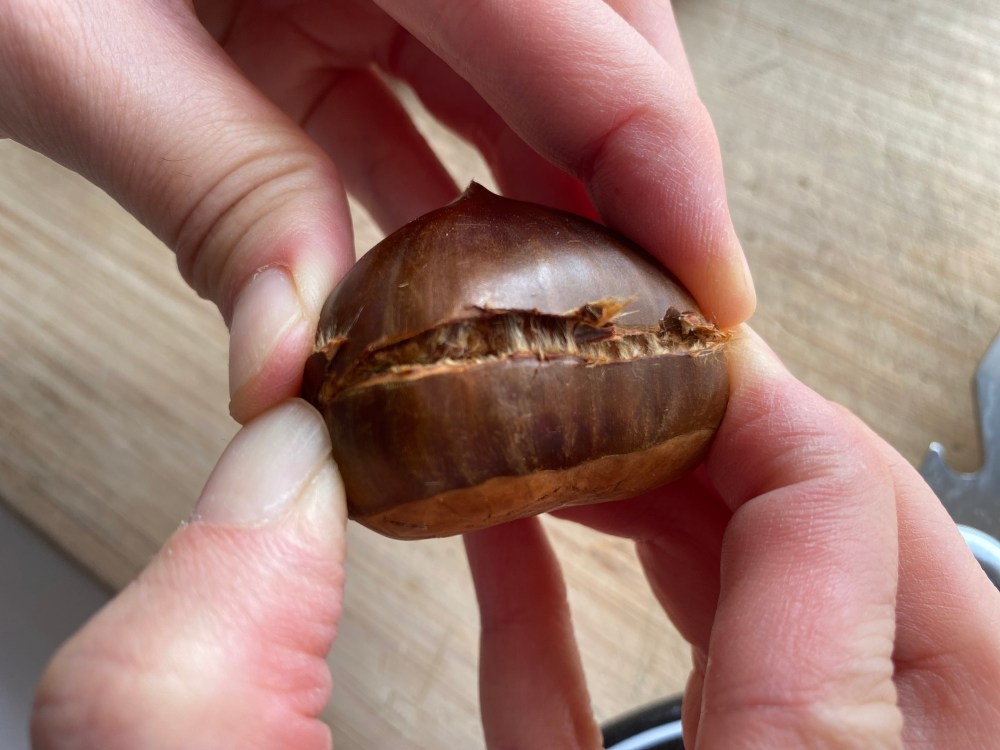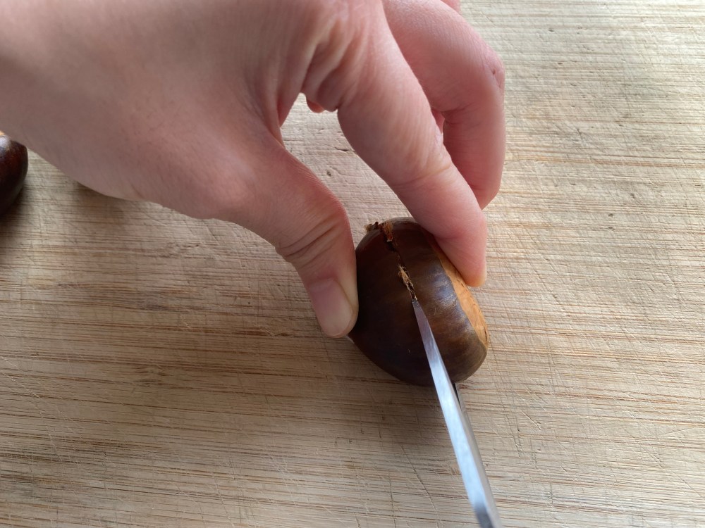 To begin, prepare the chestnuts. Place them flat side down on board. Use a small paring knife or kitchen scissors to make a slit crosswise over the top. Soak them in water for about 2 hours and oven roast them at 180-200 degrees for 30 mins until the skins split open. Let them cool enough to handle, but still warm enough to work with. Quickly peel the outer shell, then remove the inner brown membrane. Warning! It can get quite messy! If you want to save time and effort, you can simple buy the ready to use ones, that can be in cans or vacuum packed bags. For a more ‘chest nutty’ taste to the final sauce, you may also mash up 3 of them.