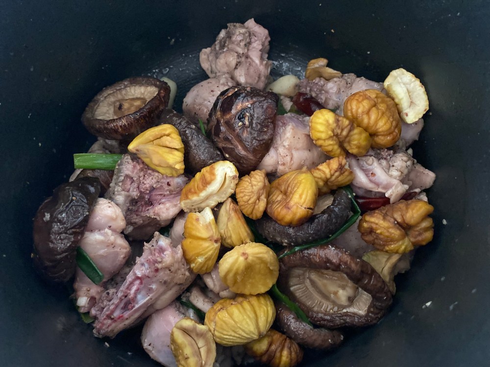 In a large pot, heat about a tablespoon of oil and add garlic, ginger and the white portions of spring onions. Stir fry until fragrant and add chicken pieces. Briefly toss around until most surfaces have browned, then add in the mushrooms and chestnuts (both wholes and mashed up), followed by light and dark soy sauce, chilli peppers, ground up peppercorns, star anise and mix well altogether. Pour in Shaoxing wine, chicken stock and water, followed by adding rock sugar and honey. Bring to a boil, then reduce heat to a simmer and let it cook for 35-40 minutes.