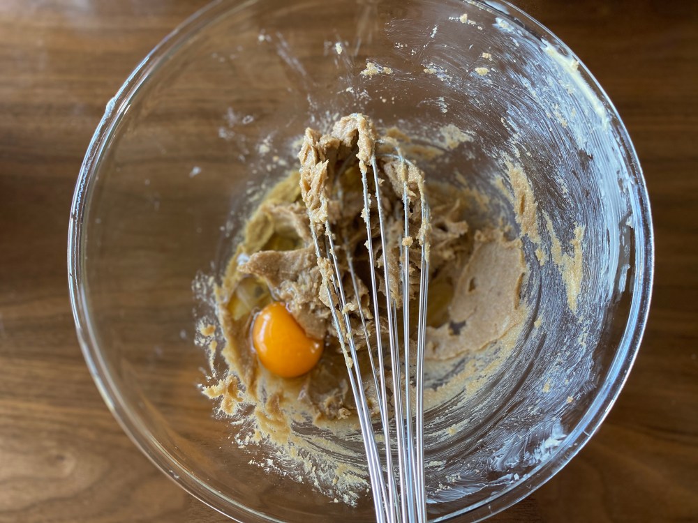 Finally, time to prepare and roll up the cookie mochi! Using gloves, roll up balls of mochi each weighing 15 grams and place them on baking paper. Using new gloves, roll up balls of cookie dough each weighing 20 grams and place on on a separate tray of baking paper. Preheat oven to 180 degrees, and line baking tray with baking paper. How to combine dough and mochi? One by one, flatten each cookie dough on your hand palm and place a piece of mochi ball in the centre of it. Gently push mochi ball so that the cookie dough is ‘cupping’ it, and slowly pinch the sides of dough together. Once mochi is enclosed, roll it a few times to make a nice ball, then place on baking paper on baking tray, and then slightly flatten them using your first two fingers. Work quickly! If dough is too sticky, chill it longer OR using a damp spoon and work directly on the baking tray
