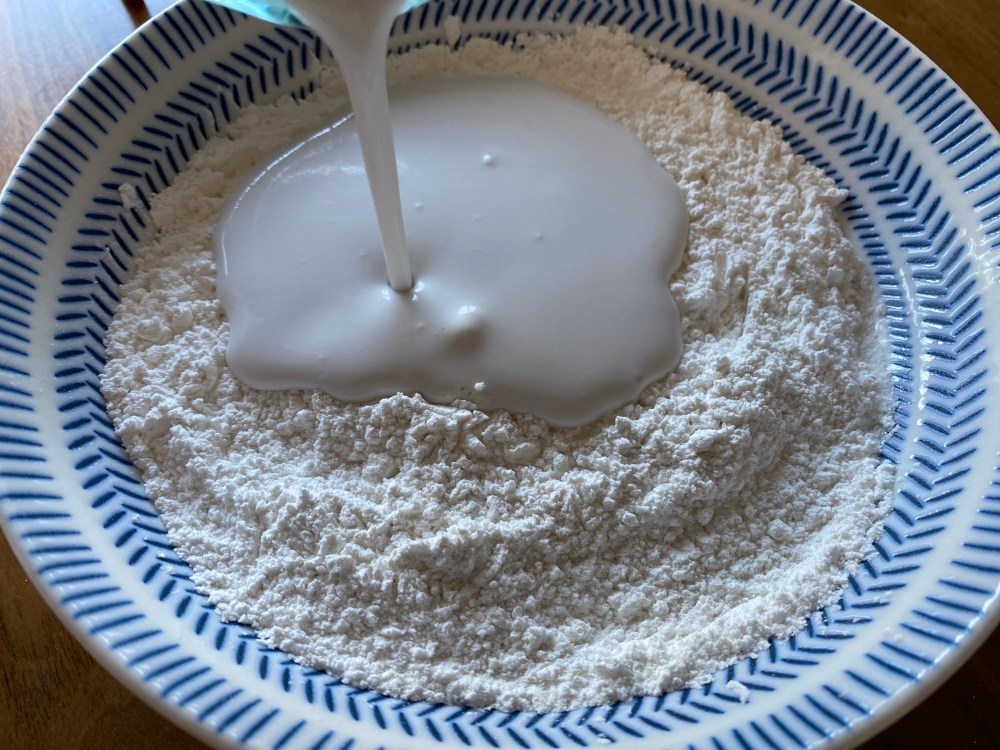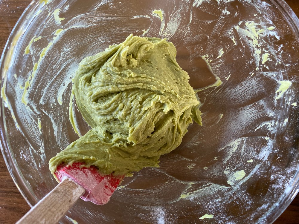 Sieve and add in flour and baking powder into the mixture. Slowly fold and mix until dough forms. Cover and place in refrigerator for at least 30 mins.