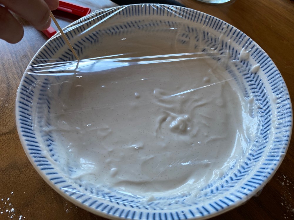 Next, prepare the mochi. In a bowl (that can withstand steaming), combine glutinous rice flour, cornflour and white sugar. Gently whisk and mix them together, then pour in coconut milk and mix well until smooth with no lumps. Cover with cling wrap and poke a few holes through cling wrap with a tooth pick, then place in steamer and let it steam for 30 minutes. Once mochi mixture is steamed, pour in the vegetable oil immediately and mix. Cover with cling wrap again and let it cool for 10 minutes. Put on gloves and begin kneading and stretching the mochi. Beware it may still be hot!