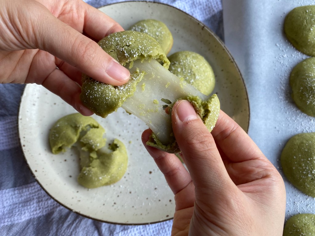Fan of pandan and mochi? You should definitely try this then! It can be quite addictive! Thanks to a friend of ours who introduced us this youtube video by John and Malie, we got to try out their recipe, and discovered these amazing mochi cookies! Strange but amazing combo! We added the juice from real leaves for the recipe, as we love a good real strong flavour of pandan and we also adjusted the quantity for the mochi to ensure every piece has got a huge amount of mochi to bite into! Took us a few tries to get the portions right, and does take practice to roll up these amazing cookies. FYI, if you want to do this properly, use a kitchen scale!