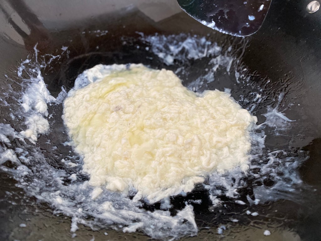 - Heat wok at low-medium. Season with oil. Pour in egg whites and stir as it whitens. Remove when it all whitens but still slight undercooked and set aside.