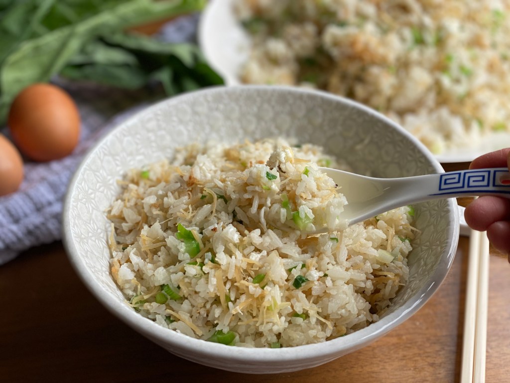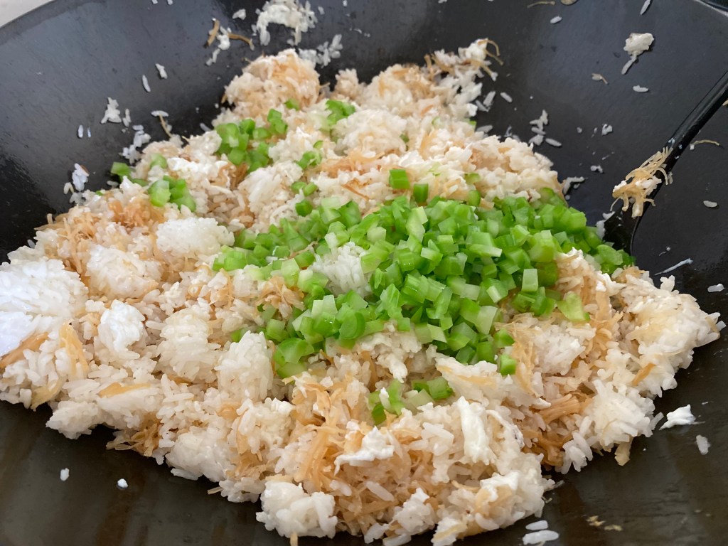 - Heat up 2 tablespoon of oil in wok on medium-high heat. Add shredded dried scallops and stir fry. When they become more browned or start ‘jumping’, remove and set a side.