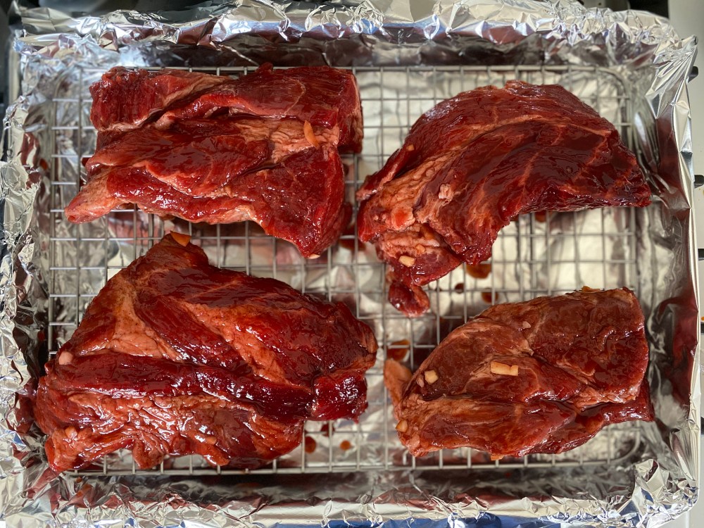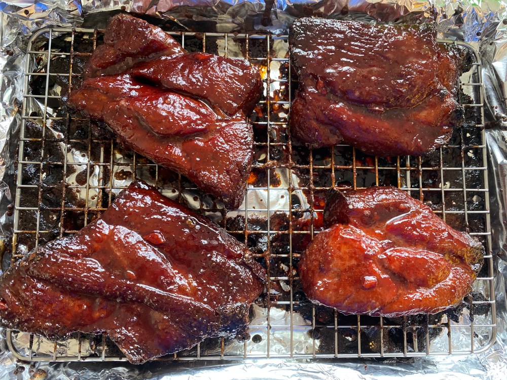 - Apply basting marinade on all surfaces of the pork pieces and place them in the oven for 20 minutes. Re-apply basting marinade on all surfaces, flip the pork and place in the oven again for 20 minutes.
