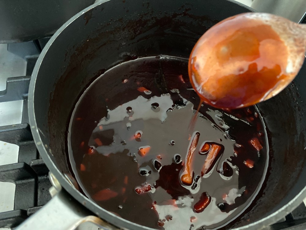 - Prepare the basting marinade by pouring the marinade into a saucepan with maltose, bring to a simmer and reduce for 5 minutes or until it thickens.