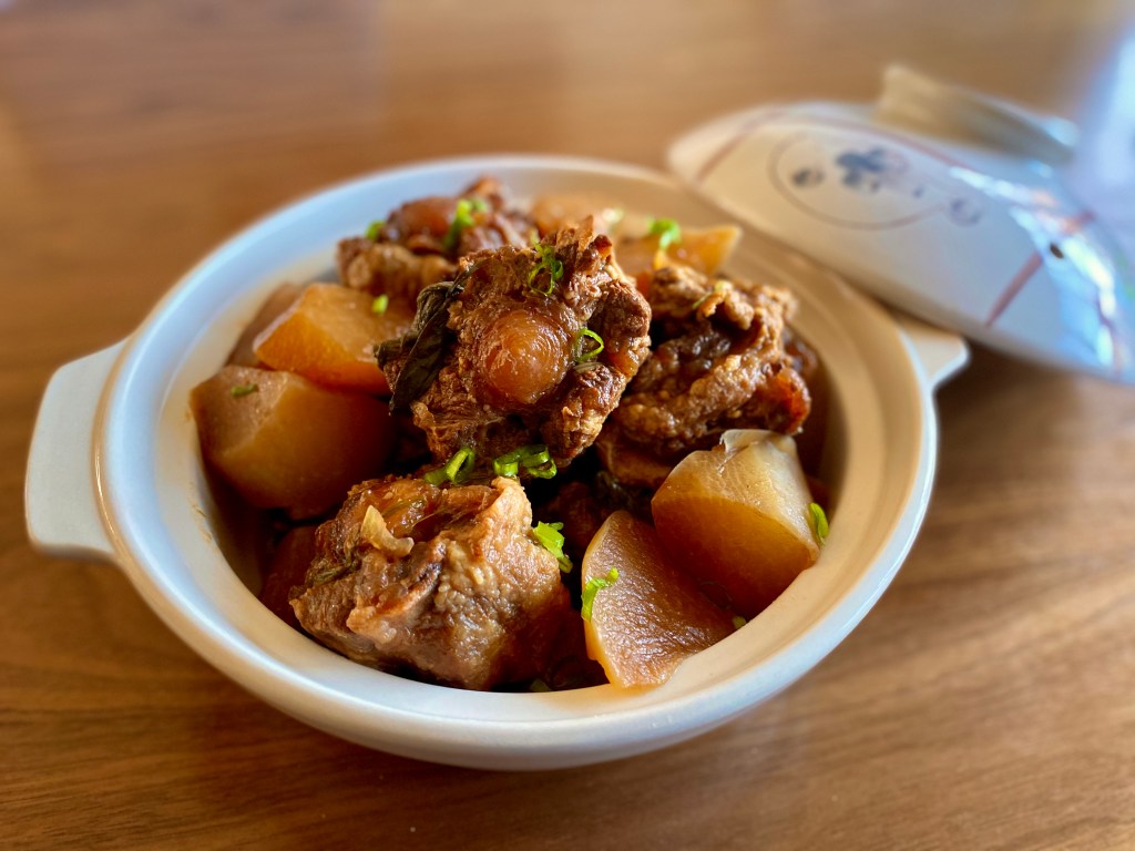 - On the last round of 15 mins when heat is turned off, add daikon chunks. Cover with lid. Once 15 mins is up, turn on heat again for the last time and let it simmer on low heat for another 30 to 45 mins until daikon is cooked and can be pierced through with a fork.