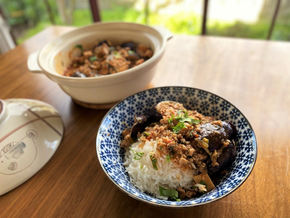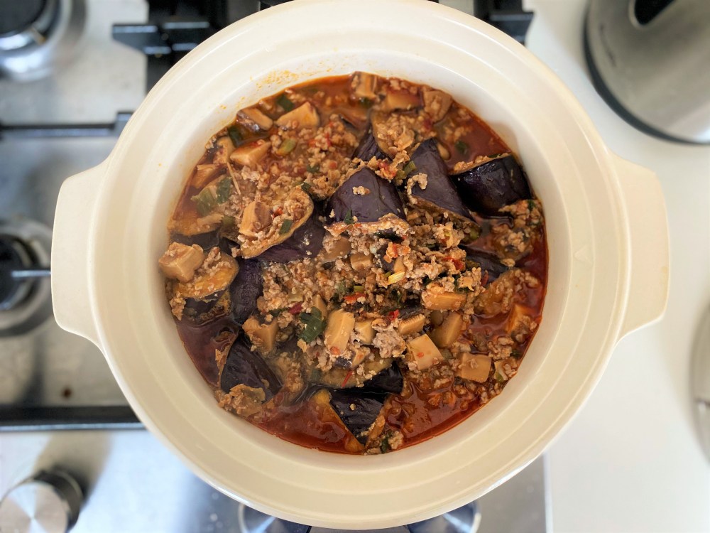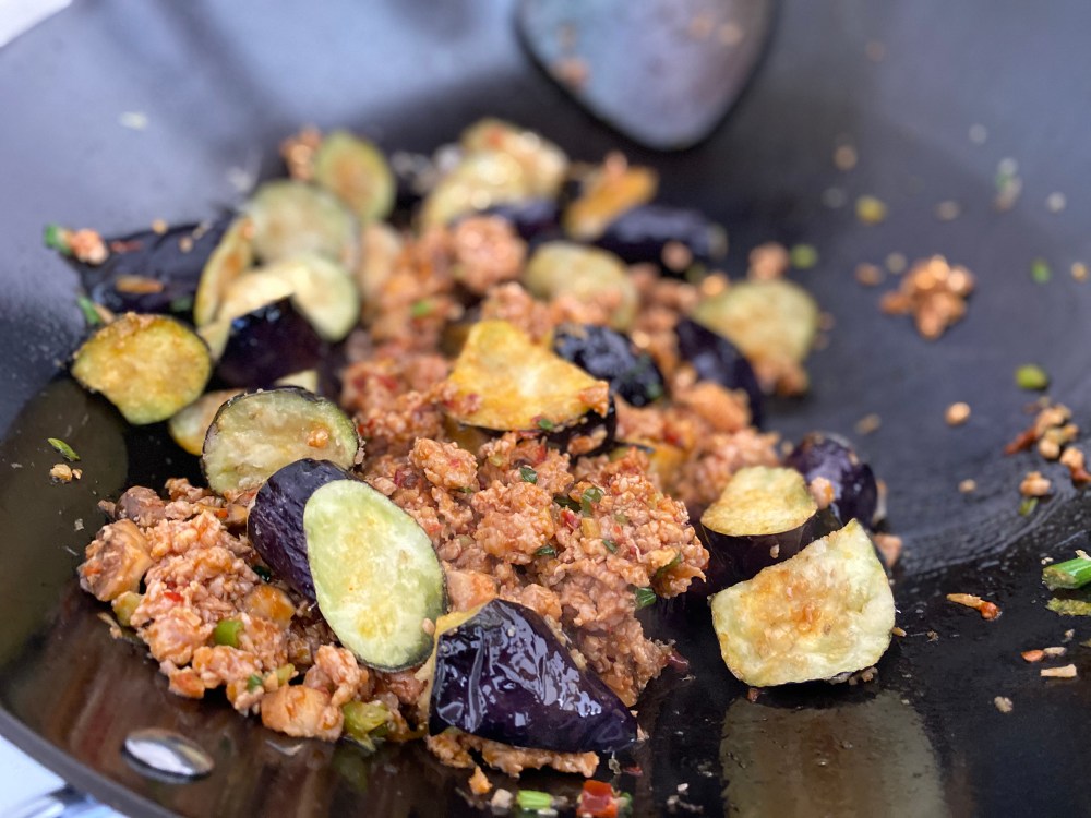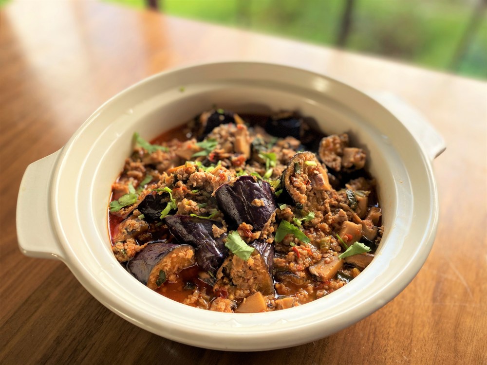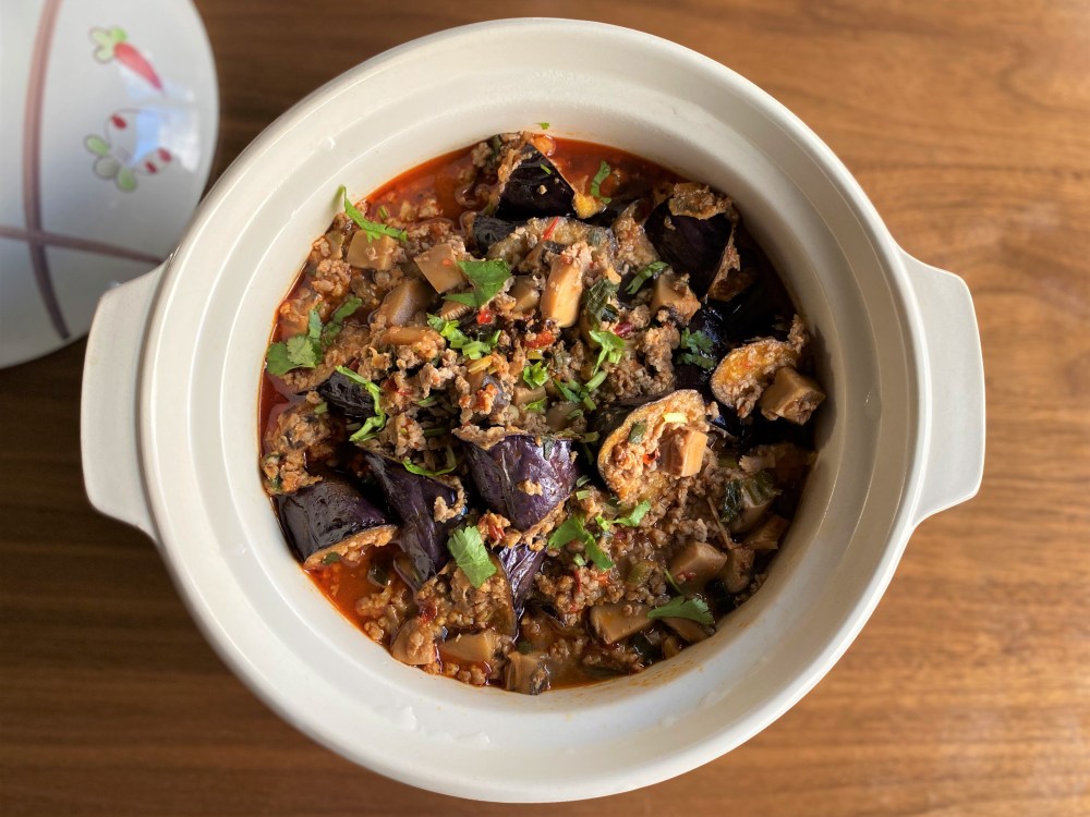 - Heat wok to medium to high heat. Add in a couple tablespoons of oil (you may reuse the deep drying oil), followed by minced garlic, spring onions and dried cuttlefish. When fragrant and garlic lightly browned, add in minced pork and stir fry a little to evenly brown the mince, then add in the chilli bean sauce, black vinegar and sugar. Stir fry and break up the mince at the same time for about 1 minute, followed by adding eggplant pieces. Stir fry for for a short 10-15 seconds to evenly coat eggplant pieces with sauce mixture and turn heat off. Transfer to a clay pot.