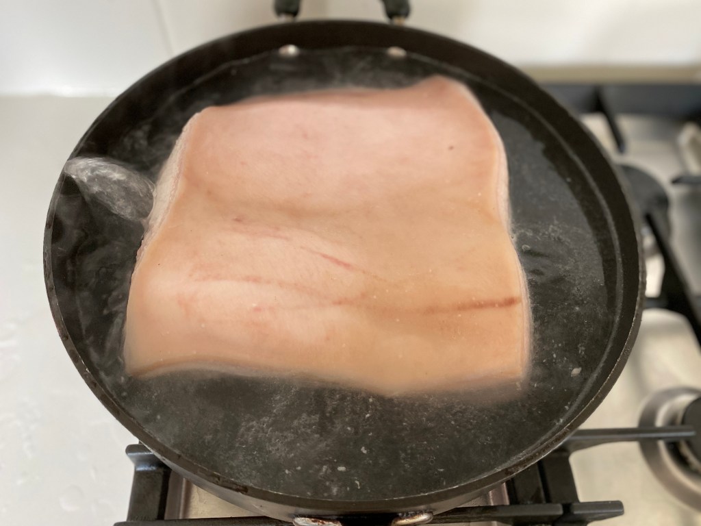 - Clean the pork belly and remove any hair. Blanch in hot water for 5 minutes. Immediately cool down with running water until cool to handle.