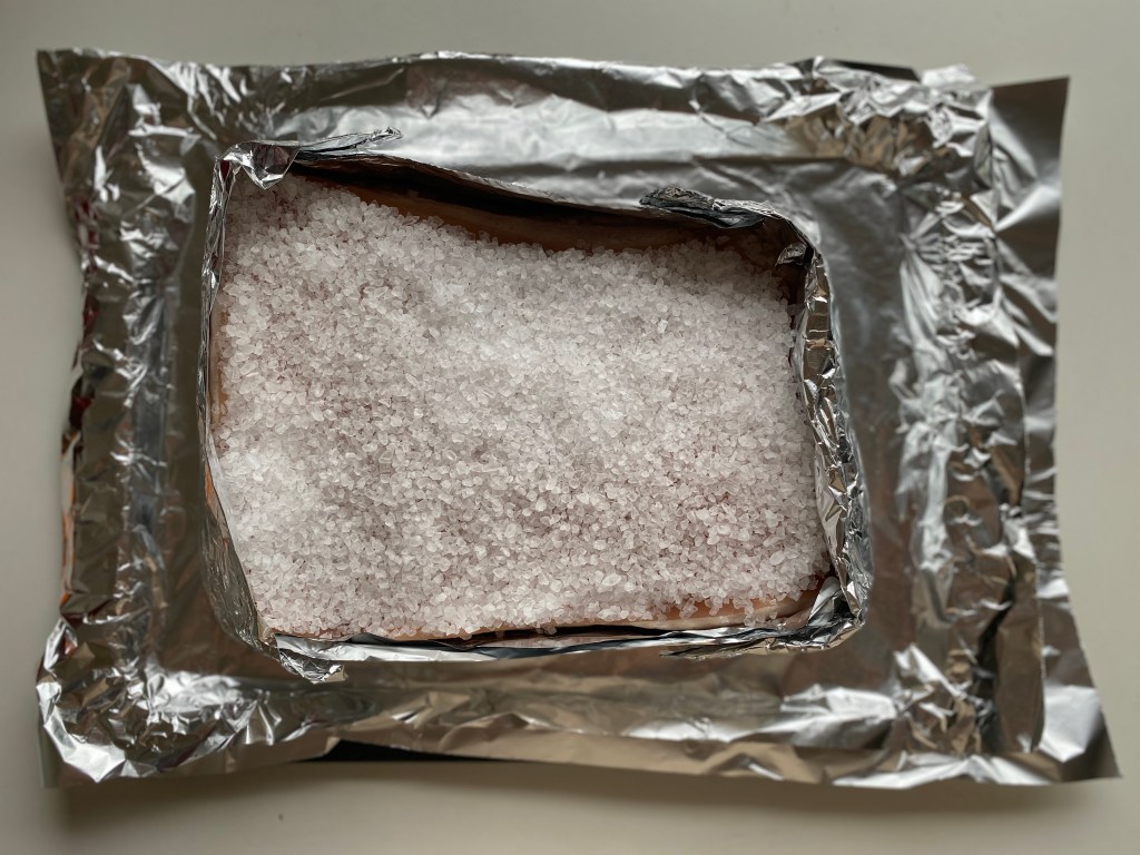 - When ready to roast. Preheat oven (broiler) at 180°C. Wipe any moisture off the skin and then evenly cover the skin with coarse salt. Line a tray with aluminium foil and place aluminium box of pork belly onto lined tray. Place in oven for 1 hour.