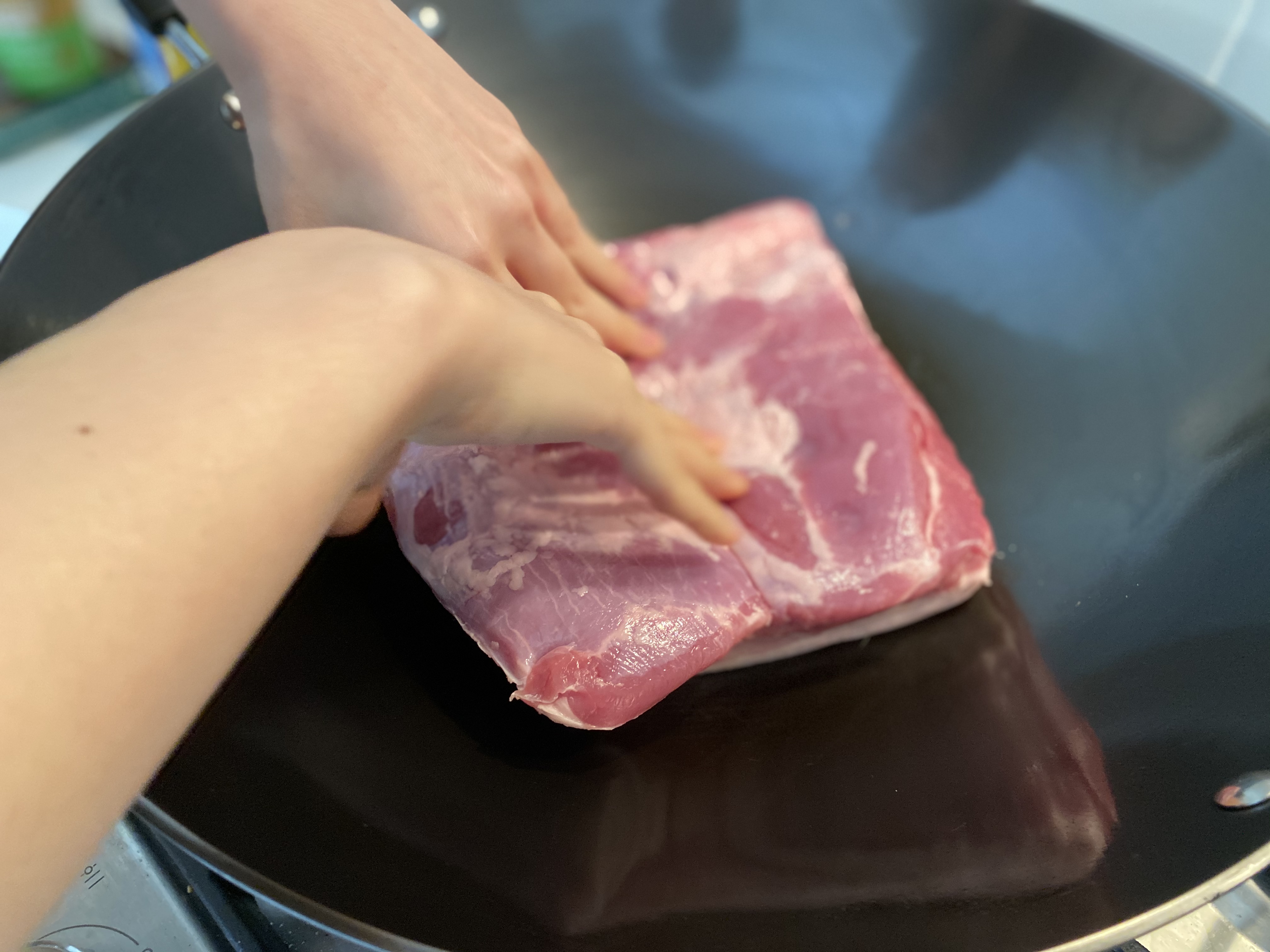- Remove hair on pork belly skin and blanch it: Wash pork belly. Heat up wok or a large pan until very hot, burn hair off by pushing skin side against hot wok/pan just for a few seconds. Pour in boiling water until pork is fully submerged. Let it cook for about 2 minutes on high heat, and then turn it over to the other side and cook for another 2 minutes. Drain water.