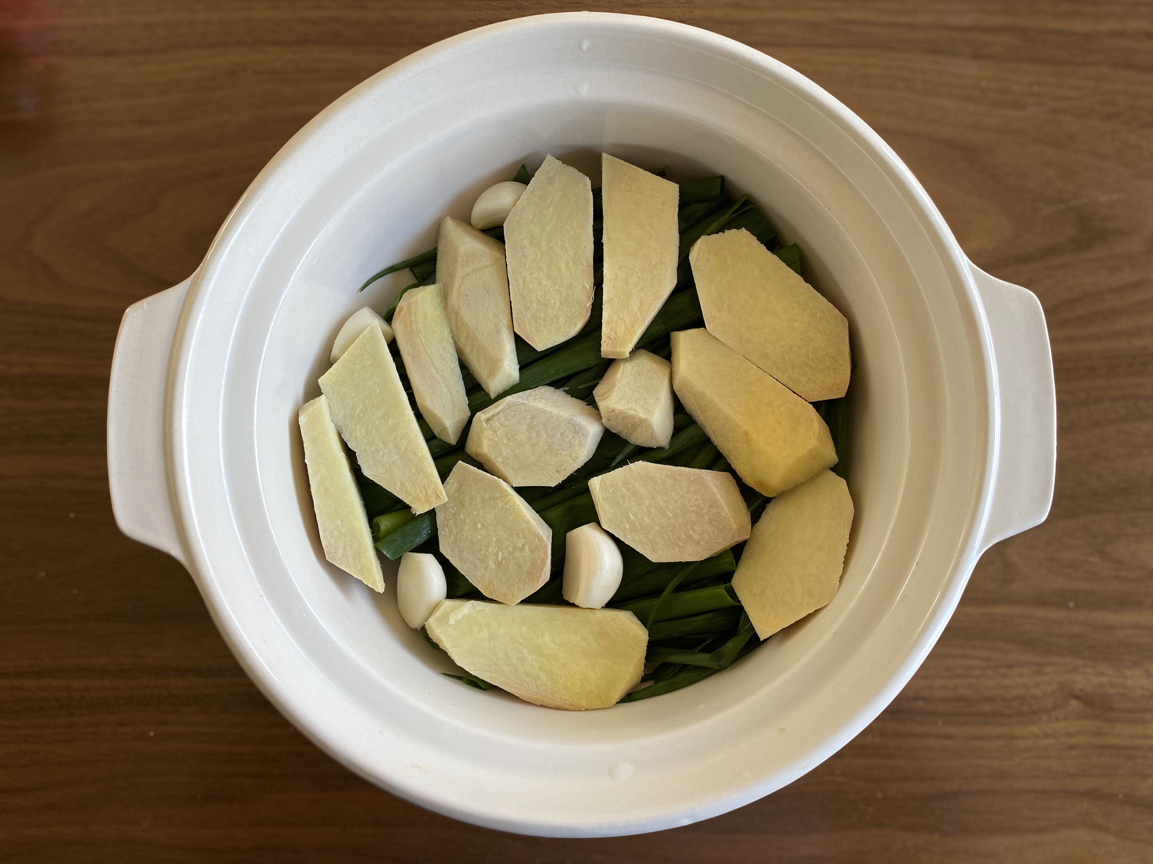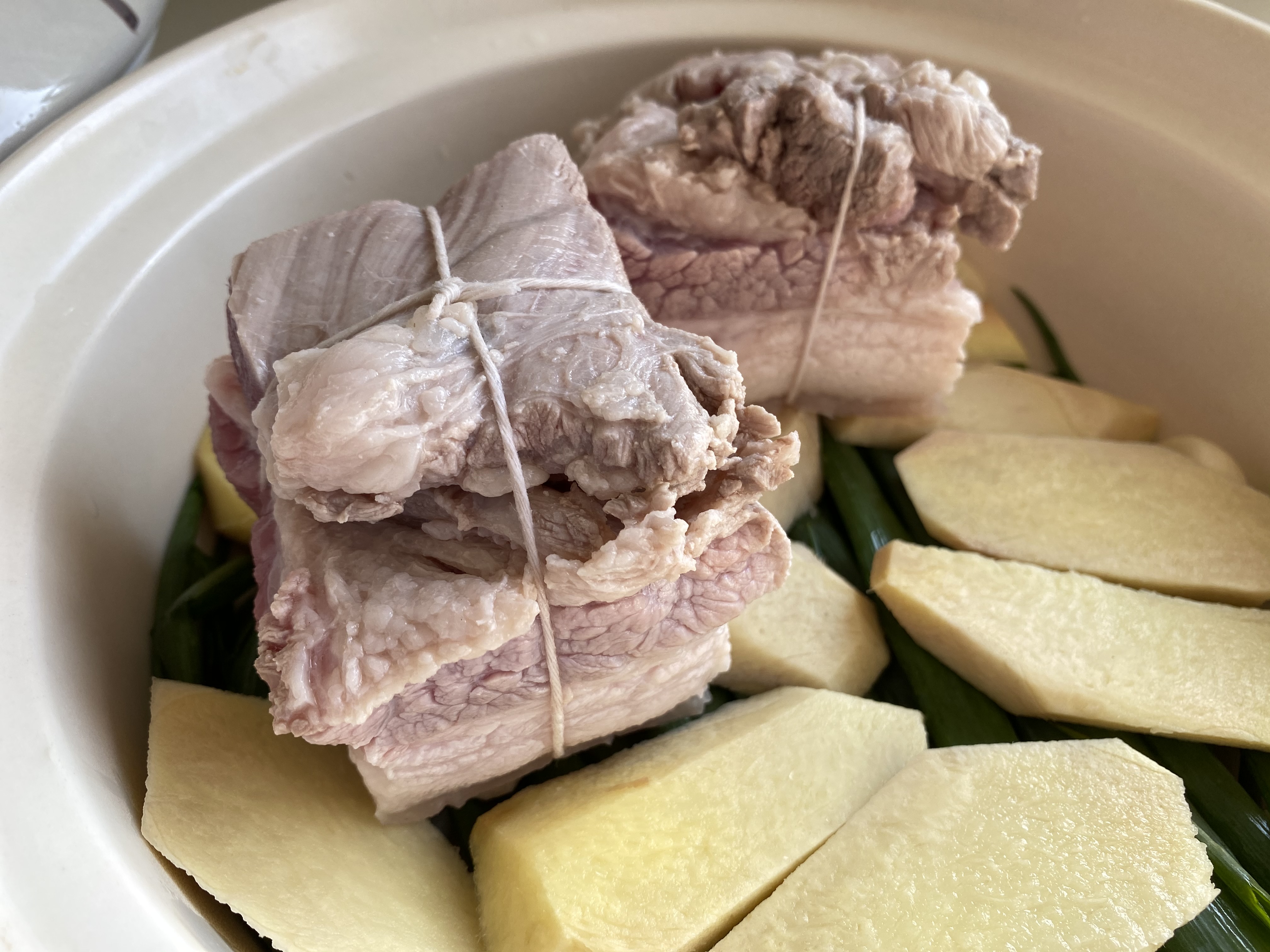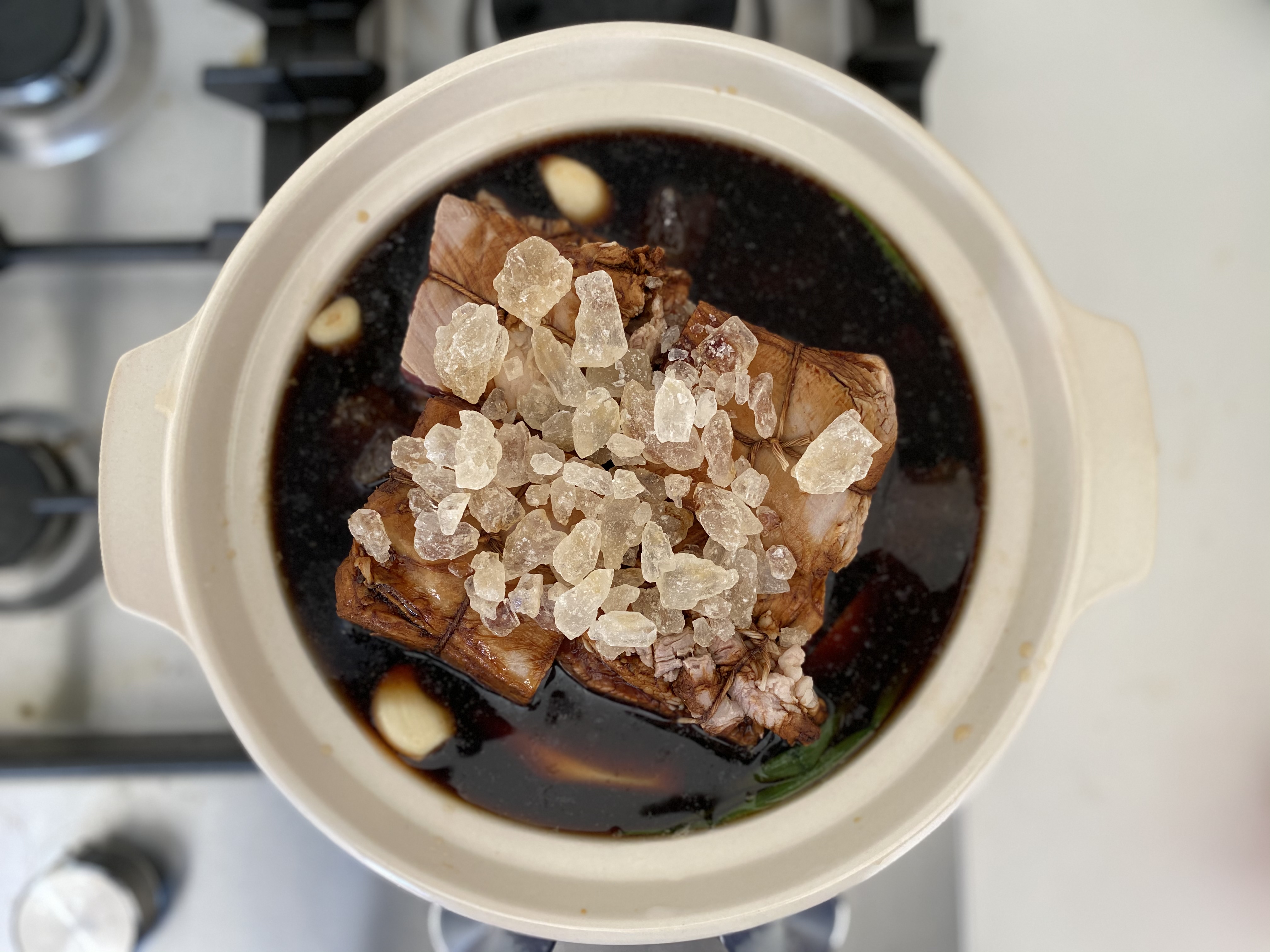 - Prepare ingredients in clay pot: Evenly spread out spring onions in clay pot, making sure to cover the bottom of the clay pot. This will avoid burning the pork belly. Neatly place ginger slices and garlic cloves above the spring onions, then place pork belly pieces on top of them with skin side down. Finally, add in all other remaining ingredients (Chinese Shaoxing wine, light and dark soy sauces, black vinegar and rock sugar). Cover with lid and let it simmer on low heat for 1 hour and 30 mins.