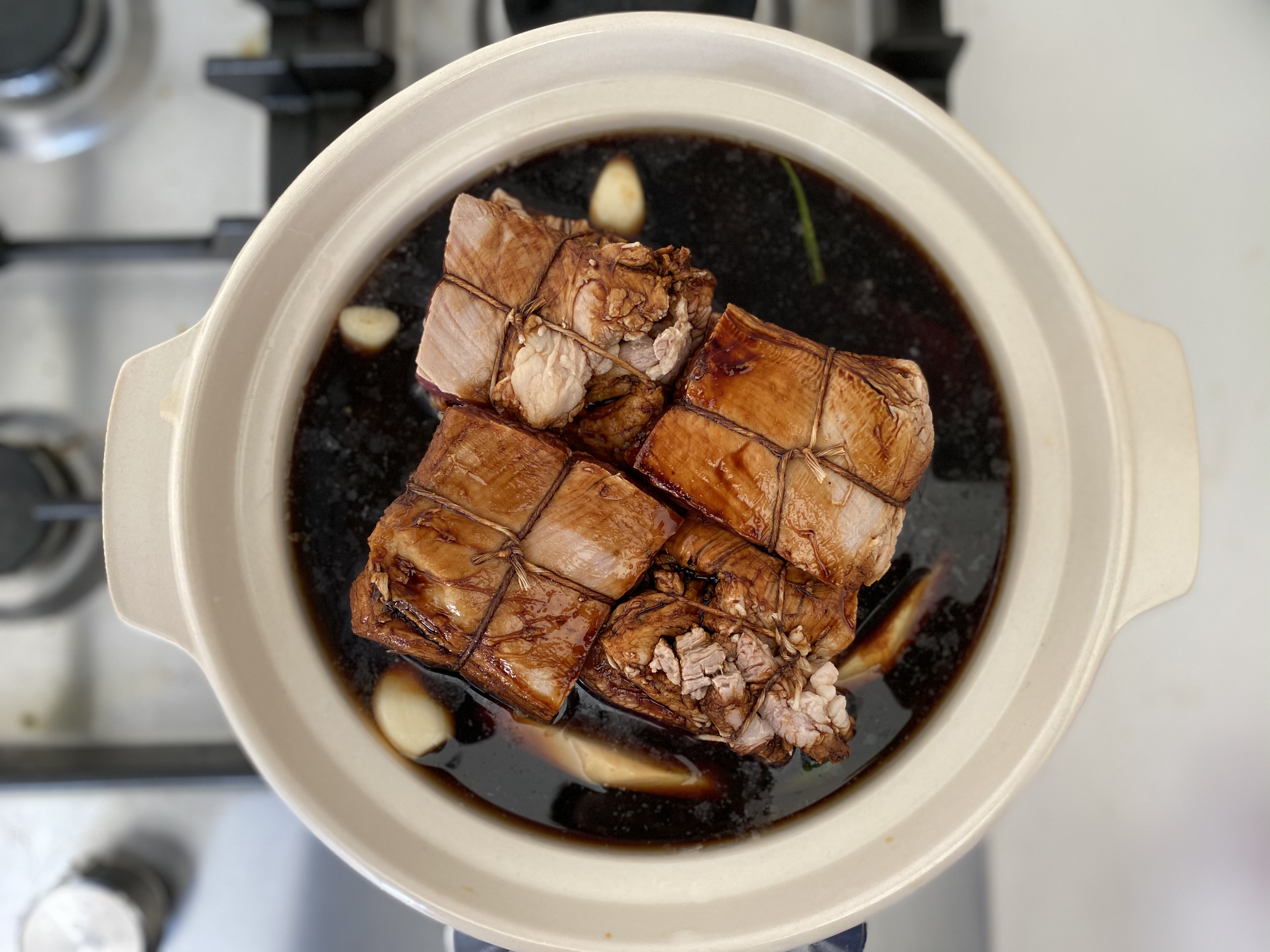 - Cut pork into smaller pieces (~5cm x 5cm). To keep them in shape, tie each piece with cooking twine similar to when you are wrapping presents with a ribbon string.