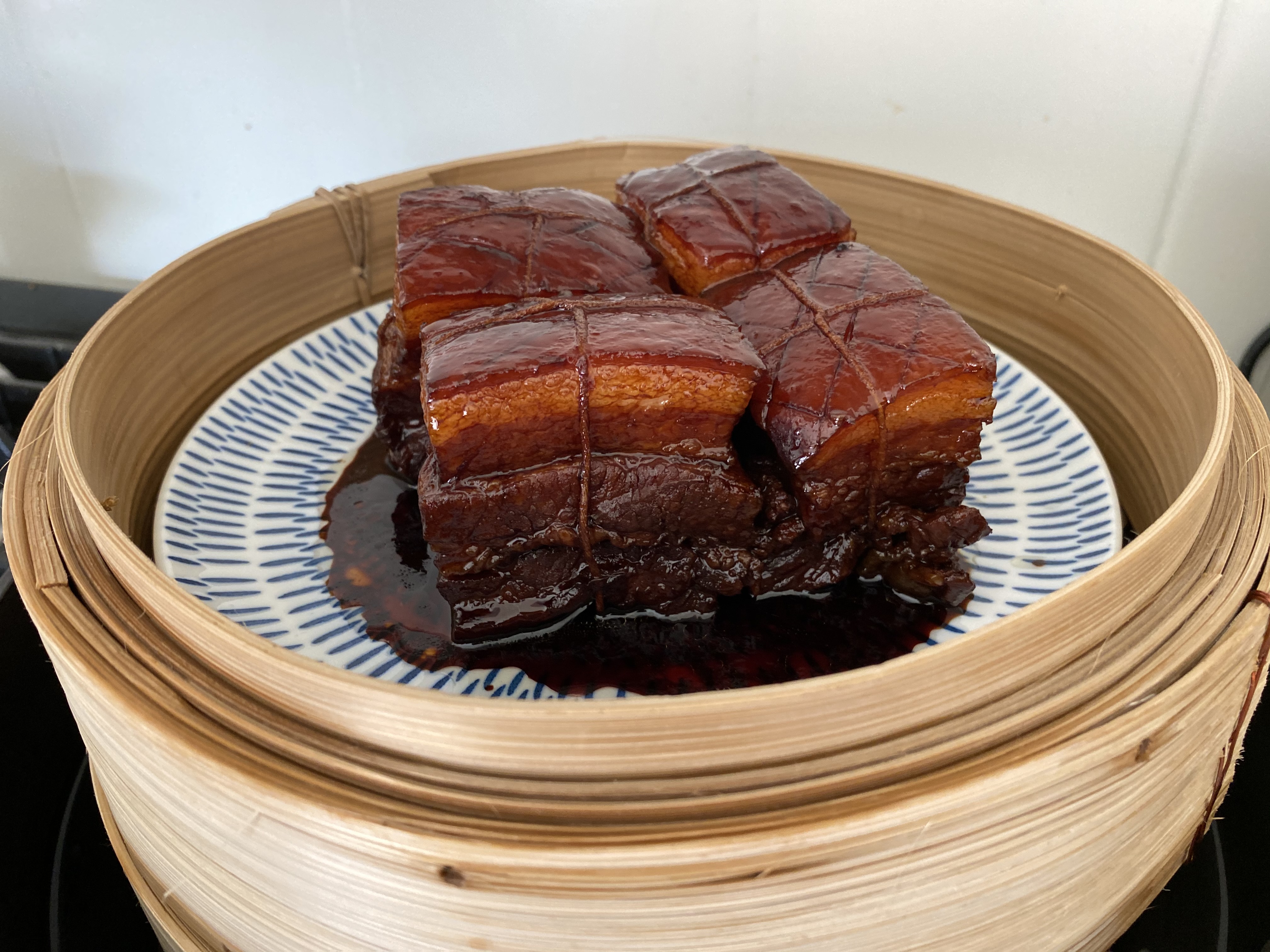 - Further steam pork pieces for 4 hours: Transfer pork pieces onto smaller heat-proof plates or shallow bowls and place them skin side up. Drizzle 1 tablespoon of the sauce from clay pot onto each plate/bowl over the pork piece/s. Steam for 4 hours. For the last 30 minutes, steam at high heat.