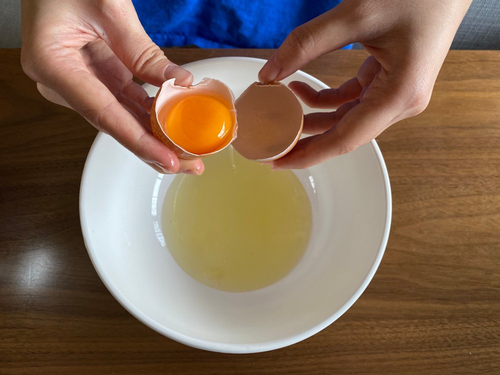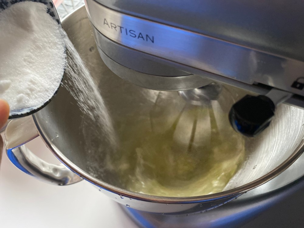 - Separate eggs to yolks and whites. Place egg yolks in a medium bowl and whites in a larger bowl (We used our KitchenAid mixer bowl).