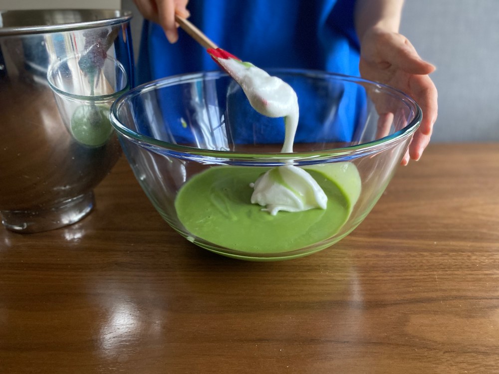 - Add the meringue into the batter in thirds. Each time, gently fold meringue into the batter to prevent breaking the air bubbles. Fold until both are mixed thoroughly.