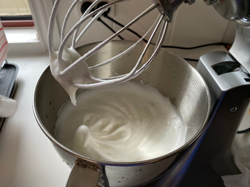- Beat the egg whites until foamy and bubbly, and gradually add in the rest of the sugar in small increments. Beat at high speed until it gets more opaque and add salt. Continue beating until stiff peaks form. To check, pull up whisk and check if beaten white eggs go up with just the tip slightly folding over. Ensure not to over beat.