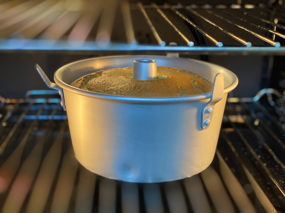 - Place pan in preheated oven and bake for 30 – 35 minutes for ~17 cm pan OR 35 – 40 minutes for ~20 cm pan. The top should turn golden brown. You may also check by using a wooden chopstick/skewer to insert into the cake, it should come out clean.