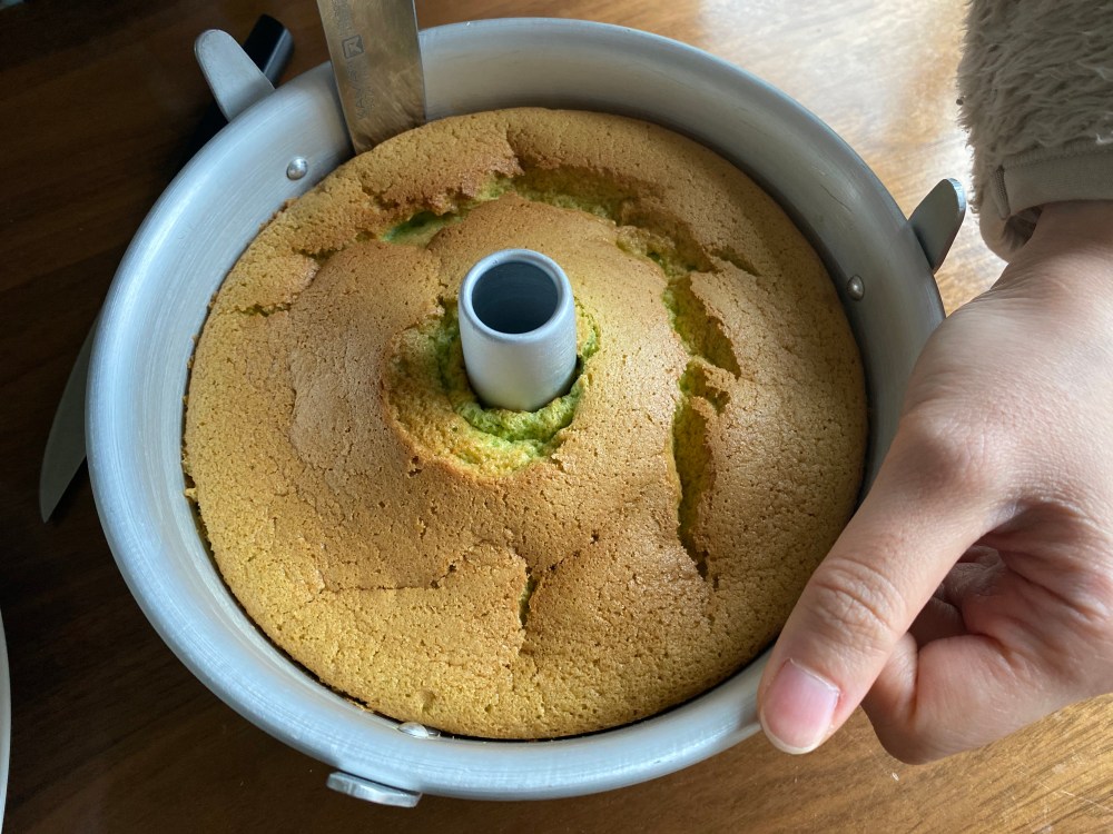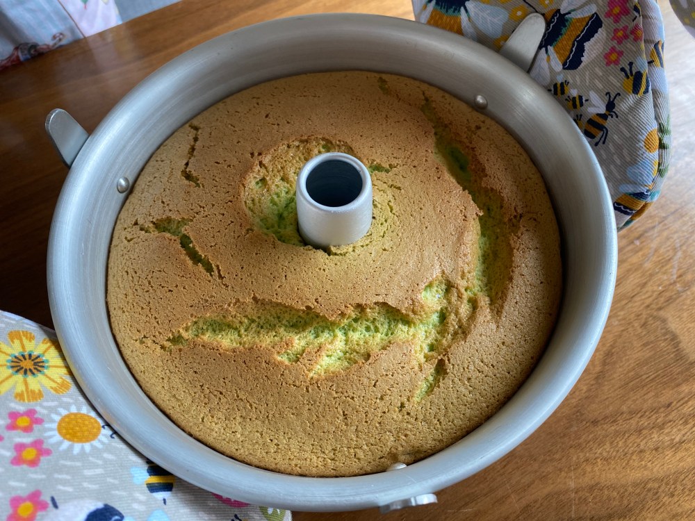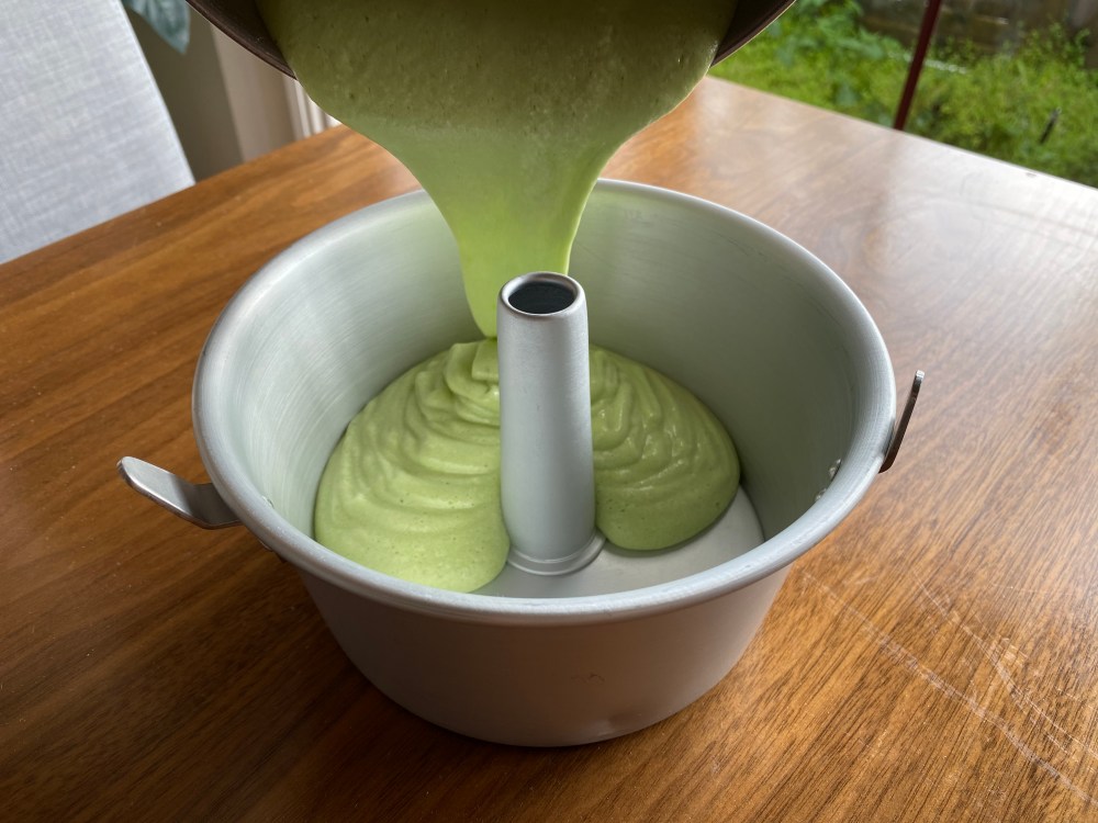 - Slowly pour mixed batter into chiffon cake pan. To prevent unwanted bubbles, pour at the same location instead of going around the pan. Run a skewer or wooden chopstick through batter to remove large air pockets, followed by lifting and dropping the pan gently on a table a couple times to prevent air going into the bottom.