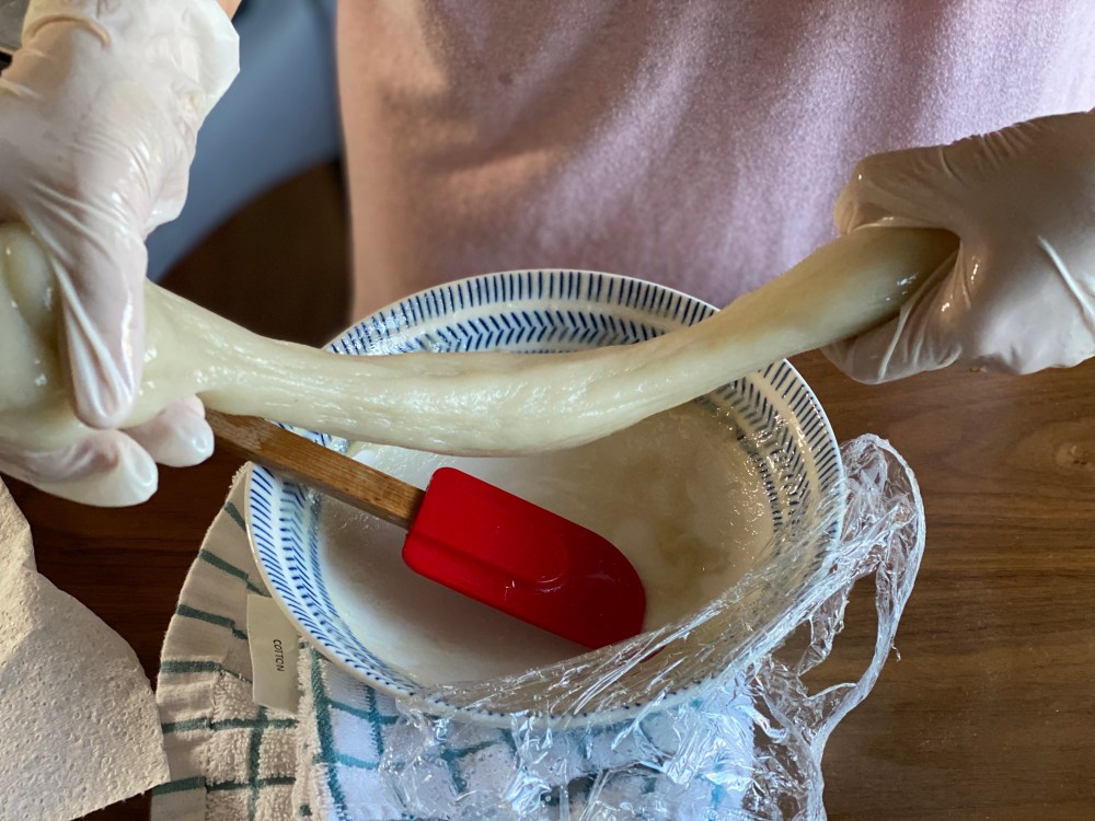 - Put on gloves and begin kneading and stretching the mochi. Beware it may still be hot