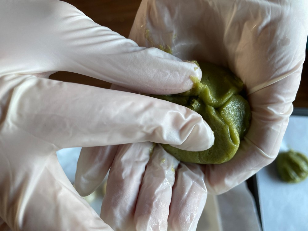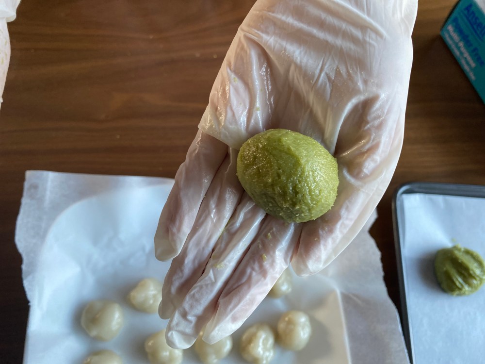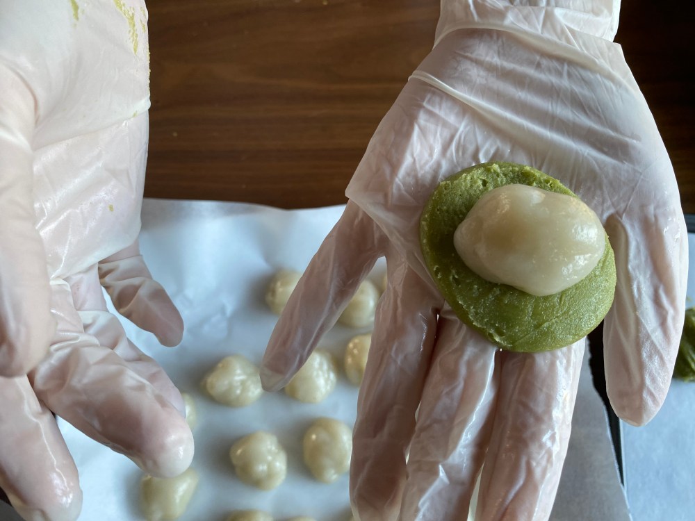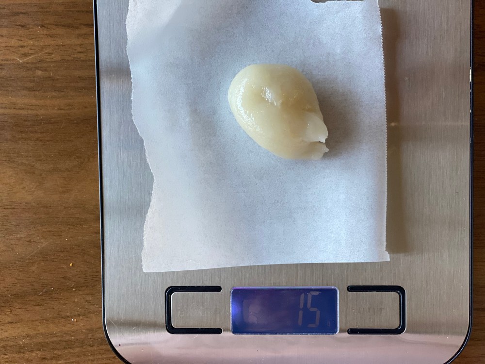 - Using gloves, roll up balls of mochi each weighing 15 grams and place them on baking paper