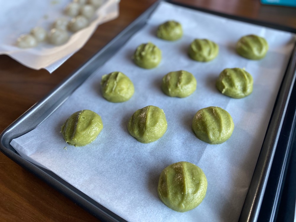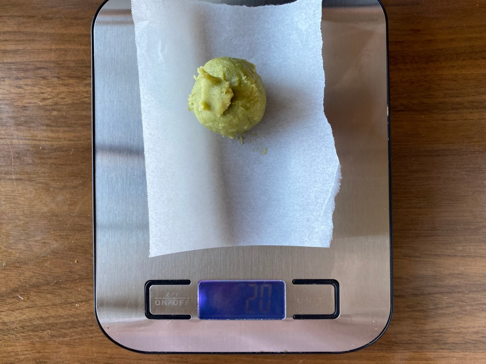 - Using new gloves, roll up balls of cookie dough each weighing 20 grams and place on on a separate tray of baking paper