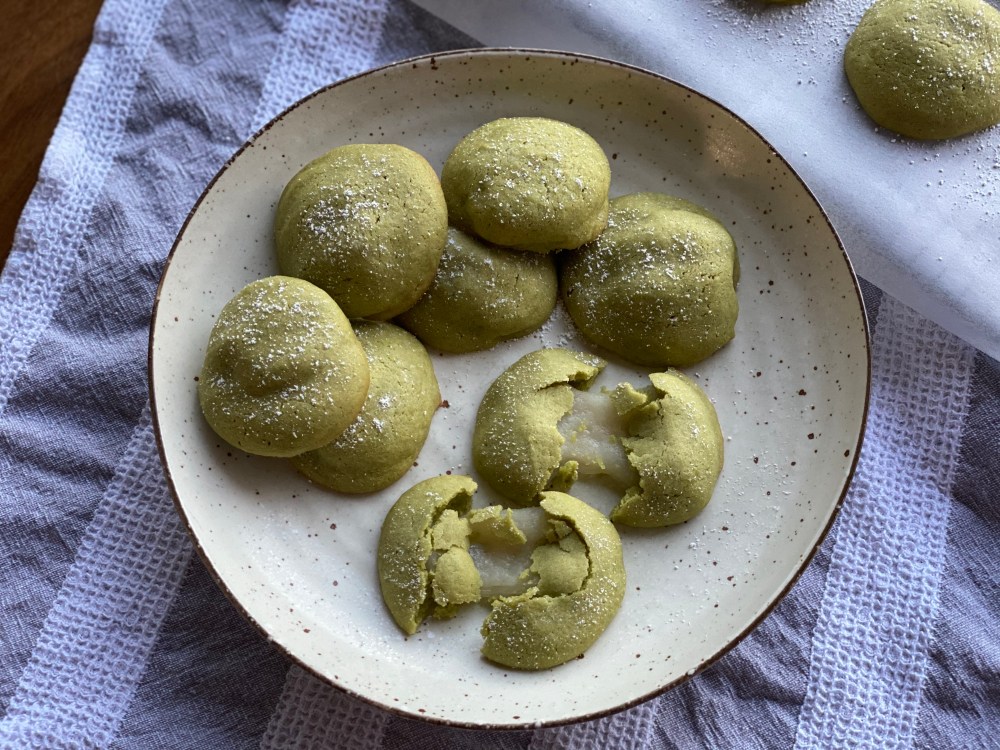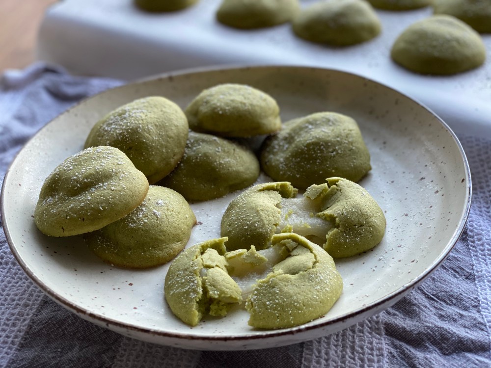 - Combine cookie dough and mochi: one by one, flatten each cookie dough on your hand palm and place a piece of mochi ball in the centre of it. Gently push mochi ball so that the cookie dough is ‘cupping’ it, and slowly pinch the sides of dough together. Once mochi is enclosed, roll it a few times to make a nice ball, then place on baking paper on baking tray, and then slightly flatten them using your first two fingers. Tip: work quickly! If dough is too sticky, chill it longer OR using a damp spoon and work directly on the baking tray
