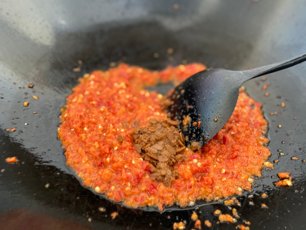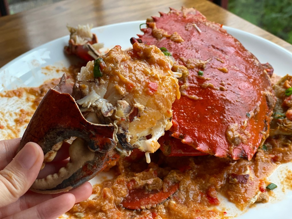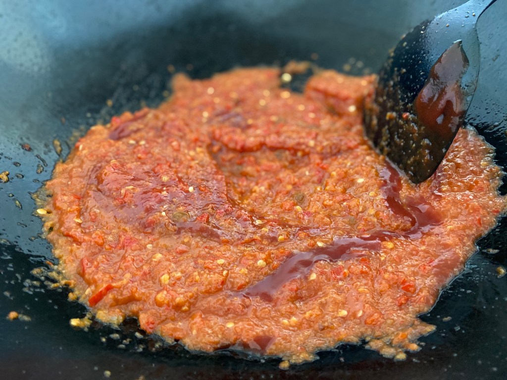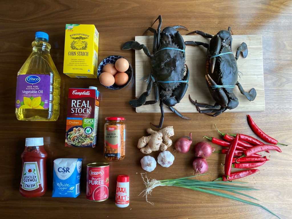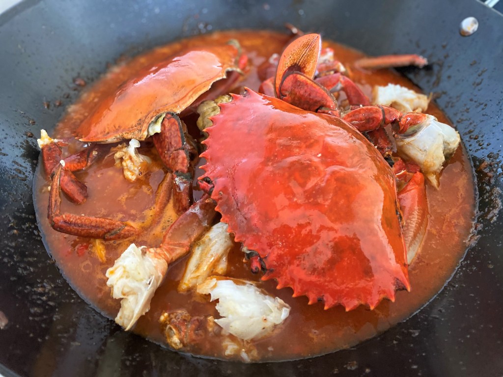 - In a clean wok, heat up about 4 tablespoons of oil. You may reuse the frying oil. At low to medium heat, fry the blended mixture of chillies, ginger, shallots and garlic until fragrant. Add salted soy bean paste, ketchup, tomato puree, sugar and salt, followed by chicken stock. Stir as you go. Taste and season to your liking at this stage. When it begins to simmer, carefully add in fried crab pieces. Quickly stir to coat pieces with sauce. Cover wok with lid and let it simmer for 15 minutes.