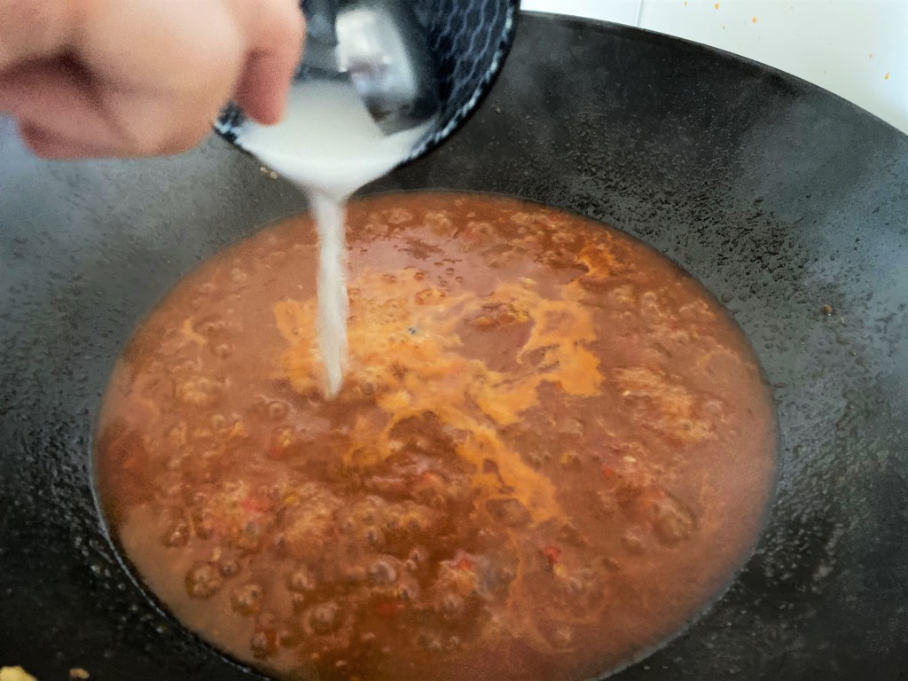 - Remove crab pieces from sauce and set aside. Pour in corn starch and water mixture and stir, followed by quickly pouring in the beaten eggs. Lightly swirl or stir as you pour in the eggs. When mixture thickens, turn heat off.