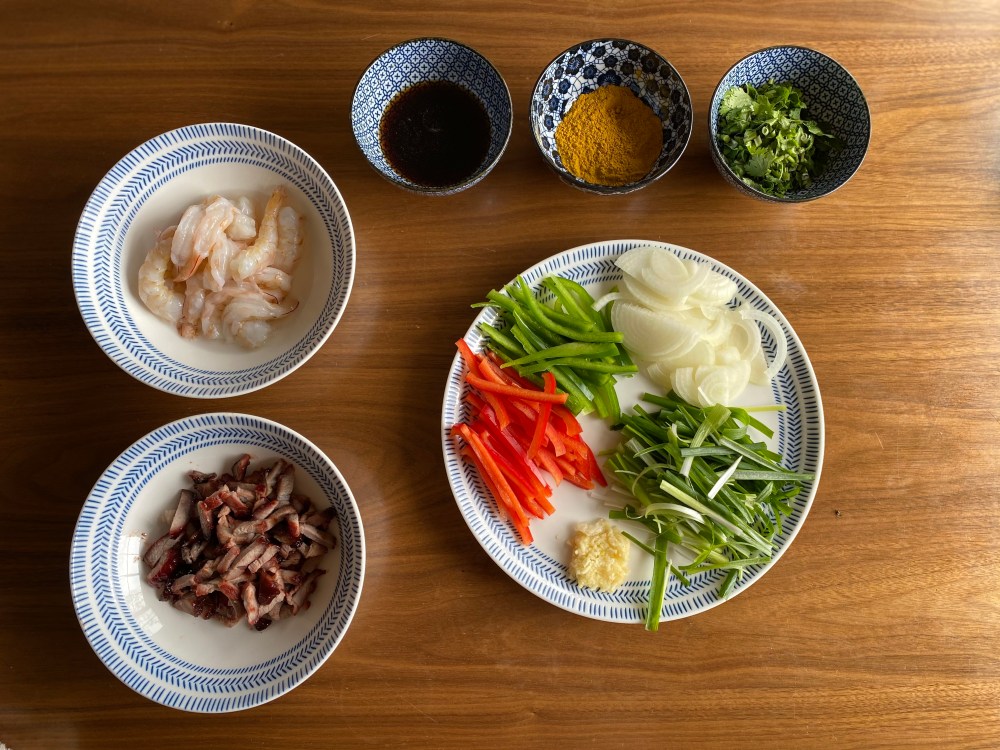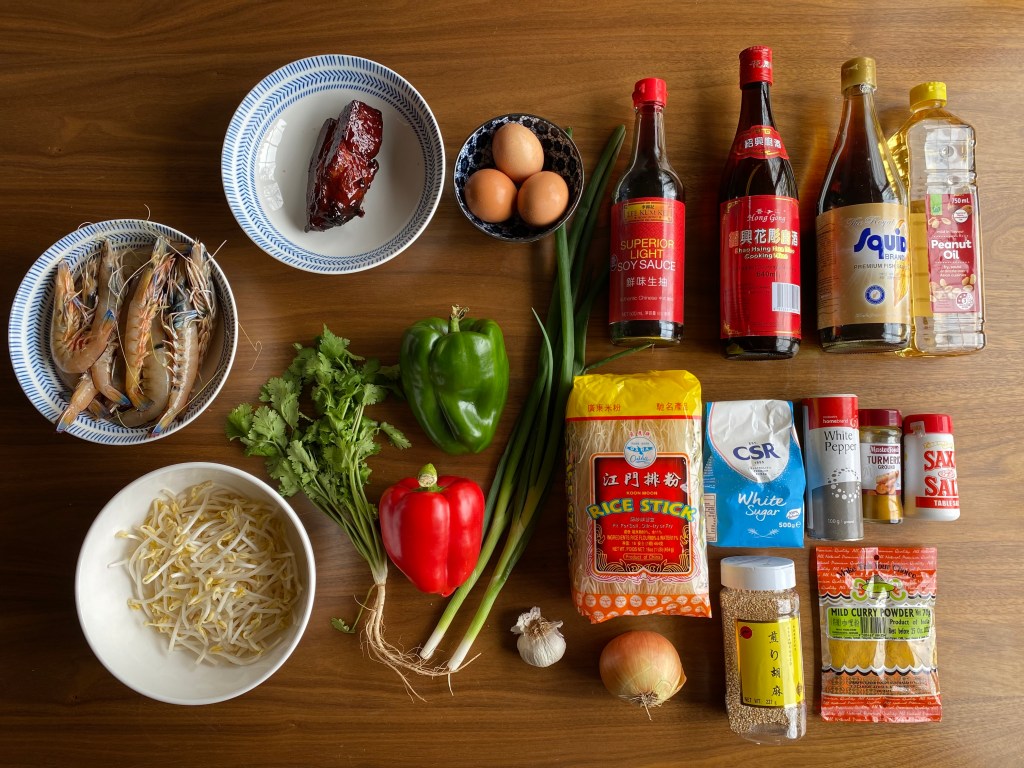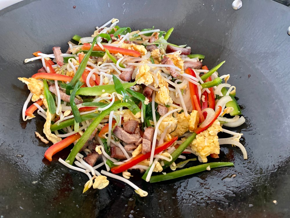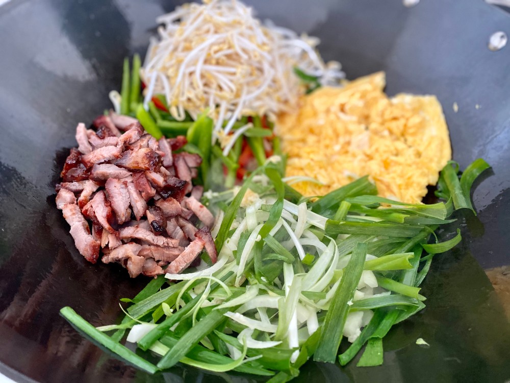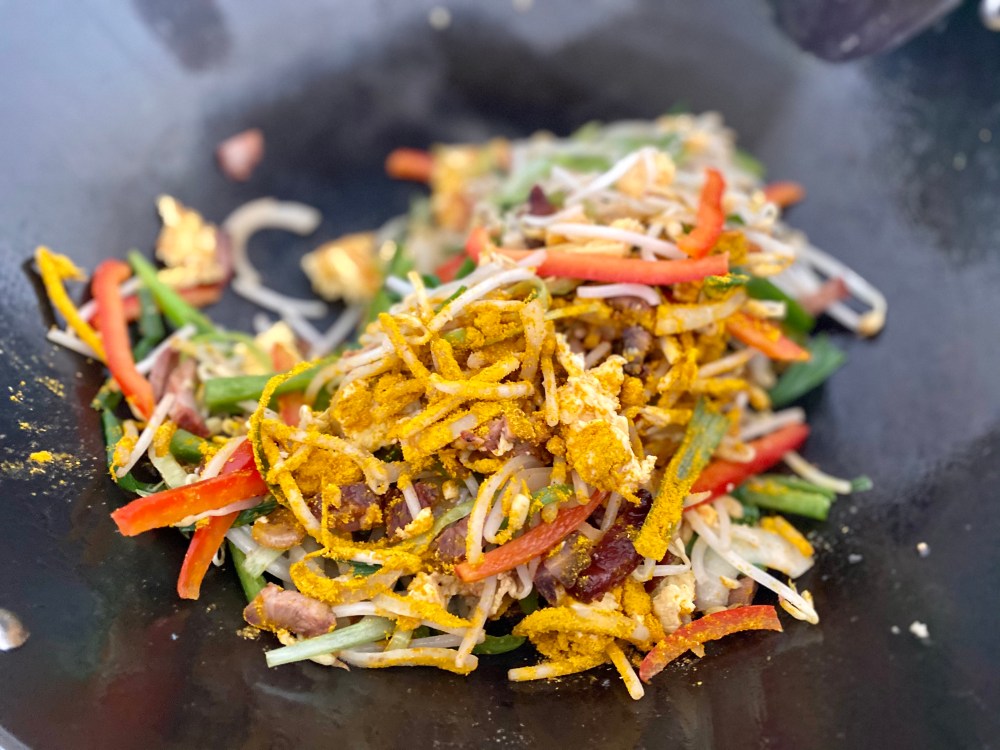 - Add in another 1 tablespoon of oil to wok and pour in beaten eggs. Quickly whisk it for a few seconds. Shift the eggs to a side of the wok to allow space to add in minced garlic, onions and spring onions. Quickly stir fry the garlic, onions and spring onions together on their own side of the wok and again make more space to add in red and green capsicums, bean sprouts followed by Char Siu. Briefly stir fry everything together and add in curry powder and turmeric. Quickly toss and stir fry until powder is evenly coated over all ingredients.