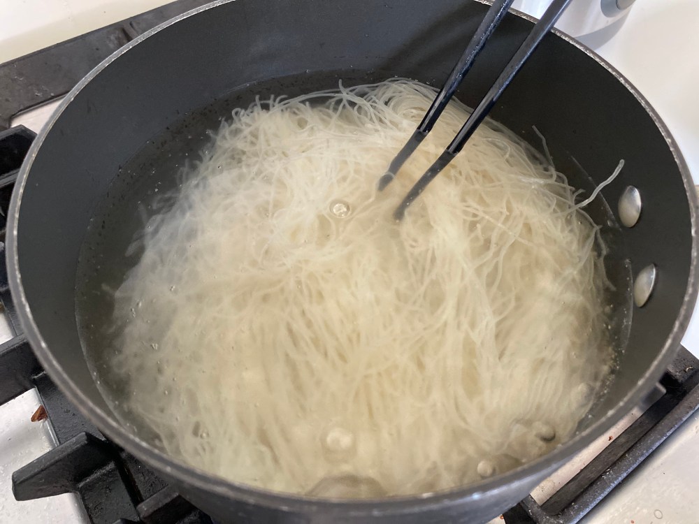 - Prepare vermicelli noodles: bring a pot of water to boil on high heat, add noodles in, let it cook for 1 minute or until water comes to a boil. Turn heat off and leave noodles in for another 30 seconds. Drain noodles, leave it aside and let it cool and dry. You may run it under cold water to stop it from cooking further.