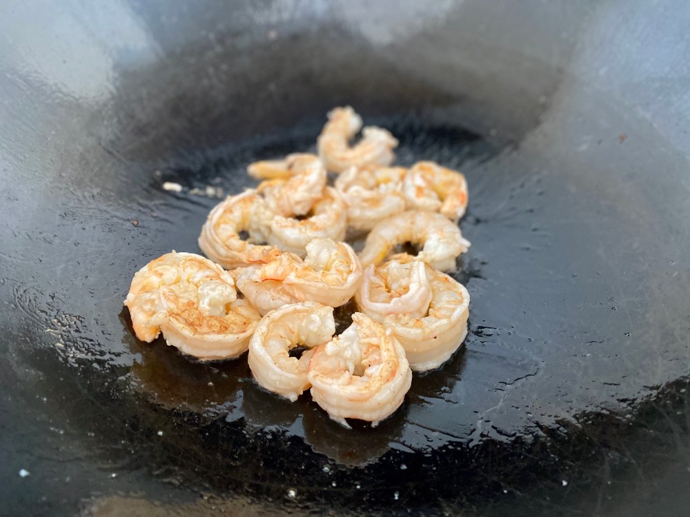 - Heat wok at medium to high. Heat up about 1 tablespoon of oil in a wok and toss in the shrimps/prawns. Stir fry for about 1 to 1.5 minutes until mostly cooked, then set them aside
