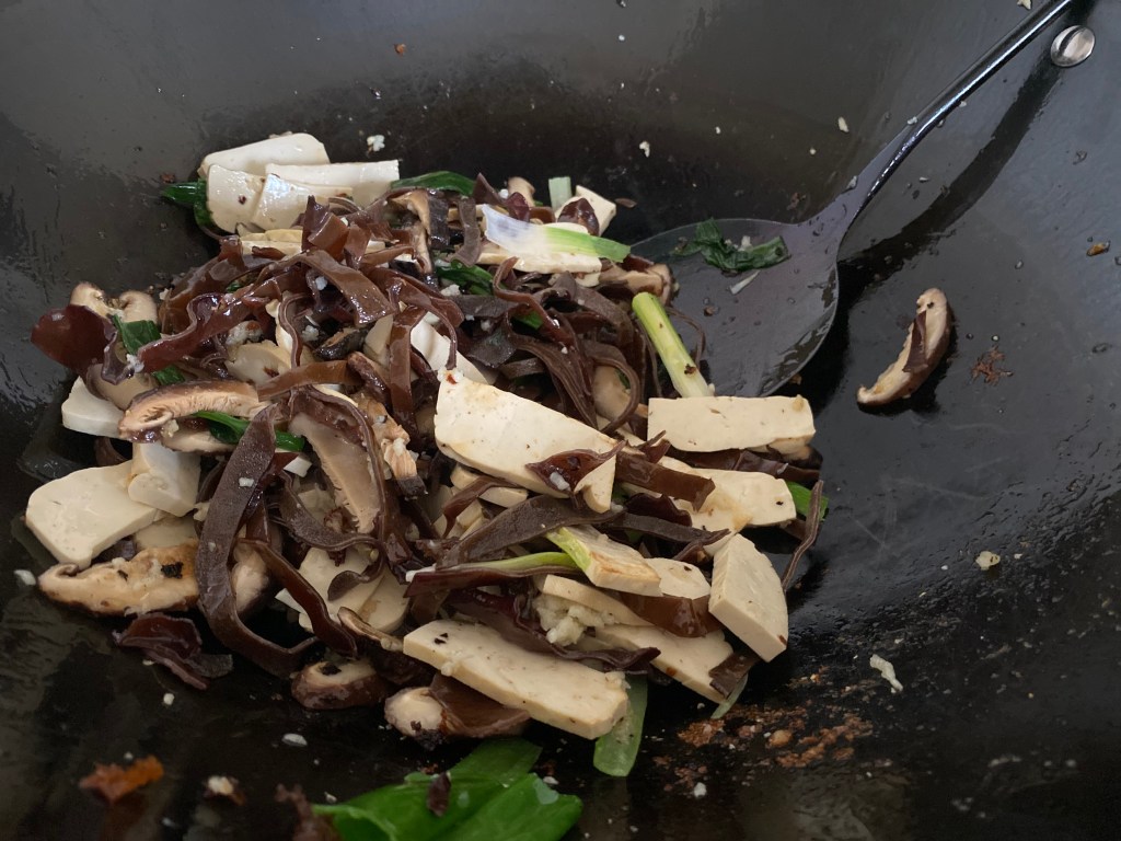 - Start adding ingredients beginning with the shiitake mushrooms, black fungus, baby corns and tofu. Pour in half of the sauce mixture and chicken stock, then stir fry for about 30 -60 seconds